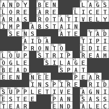 ACROSS 1. Actor Griffith 5. Benjamin's nick name 8. Straggles 12. Old wives' tales, e.g. 13. "We ___ not amused" (Victoria) 14. It is permitted: Lat. 15. Ancient river in northeast Turkey 16. Rotating or pertaining to rotation 19. Naughty child 20. Refrain by choice 21. Elected reps. 23. Had dinner 24. Small amount or degree 27. Opera by Verdi 30. Native american tent (variation) 31. Right away 34. Singer Brickell 35. Central Nebraska county 38. Empty completely 40. 480, 500 or 516 sheets of paper 41. Stare 42. Fodder prepared in a silo 44. Necklace unit 45. Argument over a trivial matter 46. Car or cant ending 47. Born 50. Lightbulb-shaped fruit 53. Motivate 57. To free from 59. Supplementary 63. Hindu god of fire 64. First name in cosmetics 65. Baking dish 66. Backtalk 67. Rend 68. Conclusion 69. Actor Baldwin DOWN 1. Jai _ 2. Typical standards 3. Window treatment 4. It is so 5. Sharp remark 6. Greek god of love 7. Remaining after all deductions 8. 54 in ancient Rome 9. Adept person 10. Set 11. Filthy place 14. Actor's bit 17. Auto club (abbr.) 18. Teat (slang) 20. SW Saudi Arabia district 22. Slept 24. Periodic rise and fall of the sea level 25. Capital of Western Samoa 26. South Vietnam president (1954) 28. Two (Sp.) 29. Pismires 30. Cylindrical with tapered ends 32. Three (prefix) 33. Petroleums 35. Ear part 36. Double curve, resembling the letter S 37. ____ Bator, Mongolia 39. Infant food 43. Yawn 47. "Death on the ____" 48. Compass dir. 49. Eastern Standard Time (abbr.) 51. Therefore, facetiously 52. Wash lightly 54. Corncob 55. _ the terrible 56. Tear apart 58. Flat circle 59. Arrange properly for use 60. Purpose 61. Parent Teacher Assoc. 62. For each 63. White ___ sheet