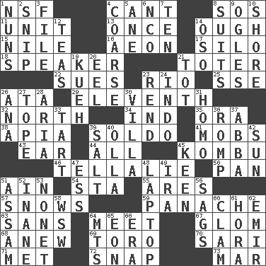 ACROSS 1. Overdraft (abbr.) 4. Patter 8. Distress signal 11. A single undivided whole 13. At one time in the past 14. Ending for "Through" and "Enough" 15. Mediterranean tributary 16. A really long time 17. Grain storage tower 18. Orator 21. Carrier 22. Takes to court 23. _ de Janeiro 25. Compass dir. 26. _ moment's notice (2 wds.) 29. Veterans Day date 32. Compass direction 34. Indiana (abbr.) 35. Mouth or opening 38. Capital of Western Samoa 39. Twentieth part of a lira 41. Crowds into 43. Ewer handle 44. Everything 45. Dried seaweed eaten as food 46. Copy Pinocchio 50. Baking dish 51. The 18th letter of the Arabic alphabet 54. R.R. building 55. Ancient Greek god of war 57. Frozen precipitation (plural) 59. Flamboyance 63. Without 64. Rendezvous 67. Seize upon or latch onto something 68. Afresh 69. "Corrida" creature 70. Indian skirt 71. Was introduced to 72. Fastener 73. Spoil DOWN 1. Religious women 2. Clip 3. Do some clerical work 4. Rough 5. One (Scot) 6. Non-commissioned officer (abbr.) 7. Nine, plus one 8. Costumes for special activities 9. Stares at amorously 10. Dinah or Pauly 12. Afternoon social gatherings 14. Bear (Spanish) 19. Malaysian steamed pastry 20. Snakelike fish 21. Small child 23. Tear apart 24. _ china 26. Santa ___, CA 27. Drink excessively 28. Operatic vocal solo 30. Country estate 31. Same (prefix) 33. Small pie 36. Frolic 37. Swedish rock group 39. Table seasoning 40. Spanish pot 42. Player for Phoenix 45. Peachy ____! 47. Curvy letter 48. Portable computer 49. Lyricist Gershwin 51. Indian state 52. Silly 53. Music written for nine 56. Sinks 58. Compass dir. 60. Burrowing marine mollusk 61. Israeli folk dance 62. Independent ruler or chieftain 64. Mountains (abbr.) 65. A really long time 66. Period