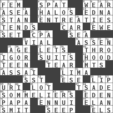 ACROSS 1. Opposite of masc. 4. Argument over a trivial matter 8. Erode 12. At sea 14. Radiant circles of light 16. Pulitzer Prize-winning author Ferber 17. Comedian Laurel of Laurel & Hardy 18. Pleas 20. Is inclined (to) 22. Automobile 23. She-sheep 24. Arrange properly for use 25. Numbers guy (abbr.) 28. Ocean 30. Small bottle 31. NE Netherlands city 35. Grow older 37. Allows 40. Through, poetically 41. Russian composer Stravinsky 42. Sets or collections 44. Parka part 45. Adolescent 46. Pull into pieces 47. Mountains (abbr.) 48. Slender Brazilian palm 50. Pale green bean 52. Fast jet (abbr.) 54. Compass dir. 55. Mouth edge 58. RI univ. 61. Car dealer's back yard 63. Sadhe (variant) 65. Wine waiters 70. Paradise 71. Dad 72. World-weariness 73. Enthusiasm 74. Stricken, poetically 75. Ooze 76. Raised railways DOWN 1. Goes without food and/or water 2. First name in cosmetics 3. Intended 4. A female animal or person 5. Baking dish 6. The first octave above the treble staff 7. Torque (variant) 8. Dripping 9. Singer Brickell 10. Afresh 11. To erase 13. Plus 15. Oceans 19. Length times width 21. _-fi 26. Friends 27. Eskimo relative 29. Respiratory problem 30. Actresses Bloom and Felton 32. Attempt 33. Greek god of love 34. Lower and raise head in agreement 35. Ripens 36. Moves 38. Standoff 39. Showing deterioration from age 41. Call ___ day 43. Indian titles of respect 49. Small island 51. Was introduced to 53. Lacquered or enameled metalware 55. Dipping utensil 56. Perfect 57. Actor Sean's family 58. United States Postal Service (abbr.) 59. Wander 60. Body of Kaffir warriors 62. Airtight sealed metal containers 64. Observe 66. Floor covering 67. Compass dir. 68. Regret 69. Small drink