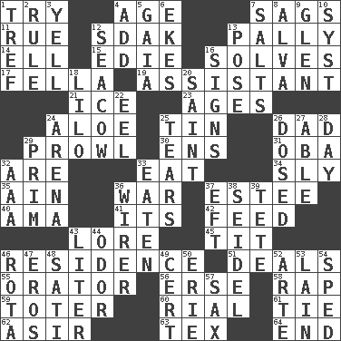 ACROSS 1. Attempt 4. Mature 7. Settles 11. Sorrow 12. Neighbor of Neb. 13. Friendly 14. Pipe bend 15. Singer Brickell 16. Finds the solution 17. Man or boy (slang) 19. Aide 21. Frozen water 23. Eras 24. _ vera 25. Shallow baking pan 26. Male parent 29. Move like a hungry wolf 30. Followers of ems 31. Chief or king in Benin or Nigeria 32. "We ___ not amused" (Victoria) 33. Consume 34. Cunning 35. The 18th letter of the Arabic alphabet 36. Armed conflict 37. First name in cosmetics 40. Nanny (var.) 41. It is 42. Nourish 43. Old wives' tales, e.g. 45. Teat (slang) 46. Dwelling 51. Allots cards 55. Speaker 56. Celtic language 58. Strike 59. Carrier 60. Monetary unit of Yemen 61. Make a knot 62. SW Saudi Arabia district 63. John Ritter's dad 64. Conclusion DOWN 1. Unclean, religiously 2. General guideline 3. Shout 4. Say or write further 5. Greek goddess of the earth (variant) 6. Supplements with great effort 7. Table seasonings 8. Inventor's middle name 9. Small, secluded valley 10. System (abbr.) 12. Manatee 13. Airs 16. Signals 18. _ and Stitch 20. Inhabitant of Heaven 22. Snakelike fish 24. Sports stadium 25. Lacerates 26. Administered medicine 27. Competent 28. 24 hours 29. Demure 32. American Automobile Association (abbr.) 33. Consumed 36. One who wires 37. Bank Draft (abbr.) 38. Beer mug 39. False hair 43. 61 cubic inches 44. Aroma 46. Roll call or roster of names 47. Greek god of love 48. Suttee (variant) 49. An absolute certainty 50. 4th largest of the Great Lakes 52. Johnson of "Laugh-In" 53. (Had) reclined 54. Broke a traffic law 57. Saxophone