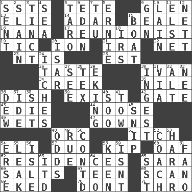 ACROSS 1. Fast planes 5. Wig 9. Small, secluded valley 13. Writer Wiesel 14. The sixth month of the Jewish calendar 15. Memphis, Tenn. Street 16. Nanny 17. One who advocates reunion 19. Nervous spasm 20. Electrically charged atom 21. Lyricist Gershwin 22. Fish or hair follower 23. Nuclear Threat Initiatives 25. Eastern Standard Time (abbr.) 26. Clothes sense 30. "Terrible" tsar 34. Small stream 35. "Death on the ____" 36. Food container 39. Have an existence 42. Yard entry 43. Singer Brickell 44. Trap for birds or small mammals 46. Moistens 47. Long dresses 48. The grampus (Milton) 51. Hankering 54. Biblical high priest 57. Superhero pair 58. Sleep 60. Clumsy lout 62. Homes 65. "Two Mules for Sister ____" 66. Table seasonings 67. Adolescent 68. Examine minutely or intensely 69. Made supply last 70. Do not 71. Through, poetically DOWN 1. Transmitted 2. Killed 3. Tinged 4. Ocean 5. Pacific island yam 6. Locale of original sin 7. The 19th letter of the Greek alphabet 8. Bert's buddy 9. Commissioned mil. rank 10. (Had) reclined 11. Otherwise 12. Remaining after all deductions 15. Water vessel 18. Big collection agency 20. Austrian river, tributary to the Danube 24. Strong, restless desires 27. Observe 28. John Ritter's dad 29. Supplementing with great effort 30. Consume 31. By way of 32. The first octave above the treble staff 33. Born 36. Morning condensation 37. Binary compound 38. Be seated 40. "Barney Miller" actor Jack 41. Pull behind 45. Sever or remove by pinching or nipping 48. Likelihood 49. Regret 50. Continued (abbr.) 52. Team commander 53. Ethiopian city, capital of Harari 54. Celtic language 55. Path through which fluid escapes 56. Small island 58. Peachy ____! 59. Is not 61. Papal veil 63. It would 64. Corporate head (abbr.) 65. Fast jet (abbr.)