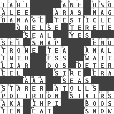 ACROSS 1. Small pie 5. A saturated hydrocarbon 8. Bear (Spanish) 11. Toward shelter 12. Caspian sea tributary 13. Tired old horse 14. Break 17. A testis 19. Threatening words 21. Cigar-shaped 22. Lick closed 23. It is so 24. Arrange properly for use 27. Fastener 29. Australian flightless bird 32. Heavy duty weighing machine 34. Afternoon social gathering 36. Of or related to the anus 37. To the inside or interior of 38. Double-curved letter 39. Electrical Unit 40. One who doesn't tell the truth 41. Two (Sp.) 42. Prevent from occurring 43. Snakelike fish 44. The founder of a family 46. Period 47. American Automobile Association (abbr.) 50. Oceans 52. A viewer who gazes fixedly 55. Ringlike coral islands and reefs 57. Characterized by complete cowardliness 59. Flight of steps 62. Alias (abbr.) 63. Body of Kaffir warriors 64. Scornful sounds 65. Nine, plus one 66. Erode 67. Overwhelm DOWN 1. Small boy 2. According to 3. San ____ (Riviera town) 4. Lacerates 5. "We ___ not amused" (Victoria) 6. Difficult 7. First name in cosmetics 8. Single time 9. Table seasoning 10. Double curve, resembling the letter S 12. Had dinner 15. Honkers 16. Liveliness 18. Big collection agency 20. Scheduled 24. Vertical member of a panel or frame 25. Bert's buddy 26. Add up to 28. Mexican monetary units 29. Related on the mother's side 30. Mother 31. Extreme 33. Or not 35. Help 36. Deep reverence 42. Started a card game 45. Vintage cars 47. Tate display 48. Nest on high 49. Scent 51. Thick slices 52. Argument over a trivial matter 53. Casino tip 54. Actor Alda or Thicke 55. Cuckoo 56. The Jewish people; Israel 58. Choose 60. Friend of Pooh 61. Compass dir.