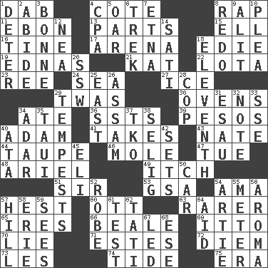 ACROSS 1. Small moist lump or mass 4. ____ d'Azur (French Riviera) 8. Strike 11. Inky black, to poets 13. Pieces 15. Pipe bend 16. Prong on a fork 17. Sports stadium 18. Singer Brickell 19. Ferber et al. 21. Krazy ___ of comics 22. Globular water bottle used in Asia 23. To sift 24. Ocean 27. Frozen water 29. It was, poetically 30. Baking chambers 34. Had dinner 36. Fast planes 39. Mexican monetary units 40. First of billions? 41. Proceeds 43. Nathan's nickname 44. Grayish beige 46. Undercover agent 47. Third day of the wk. 48. Satellite of Uranus 49. Hankering 51. Title for a knight 53. Girls' org. (abbr.) 54. Nursemaid (var.) 57. Command 60. Baseball player Mel 63. Less widely known 65. Angers 66. Memphis, Tenn. Street 69. "Tell ____ the Marines!" 70. Untruth 71. _____ Park, CO 72. South Vietnam president (1954) 73. French article 74. Periodic rise and fall of the sea level 75. Epoch DOWN 1. Prevent from occurring 2. Remain 3. Maid-servant 4. Accounting whiz (abbr.) 5. Rowing implement 6. Long journey 7. Inactive volcano in Sicily 8. Redecorate 9. Set down 10. Entreaty 12. Teachers' org. 14. Suttee (variant) 18. Veterans Day date 20. Compass dir. 25. 90 degrees 26. Indian state 28. Police officer (slang) 29. Storms 31. Son of Isaac 32. Musical sound 33. Compass dir. 34. The sixth month of the Jewish calendar 35. "Change" in Tahitian 37. Ring climax 38. Major League Baseball Commissioner Bud 40. _ moment's notice (2 wds.) 42. Arranges properly for use 45. Connecticut Ivy Leaguer 50. Automobile 52. Loose flowing garment 54. Nick name for Arthur 55. Distance measurement 56. Odor 57. Land elevation 58. One of the Great Lakes 59. Observes 61. Trial 62. Jacques of French films 64. Help 67. Directed 68. Compass dir.