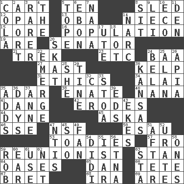 ACROSS 1. Heavy open wagon 5. "___ Little Indians" 8. Downhill vehicle 12. Brightly colored fish 13. Chief or king in Benin or Nigeria 14. Sibling's daughter 15. Old wives' tales, e.g. 16. Census information 19. "We ___ not amused" (Victoria) 20. Elected representative 21. Long journey 23. And so on (abbr.) 24. Sound made by sheep 27. Vertical spar for supporting sails 30. Seaweed 31. Moral principles 34. Jai ____ 35. The sixth month of the Jewish calendar 38. Maternal 40. Nanny 41. Mild oath, euphamism for damn 42. Eats (away) 44. Centimeter-gram-second unit of force 45. "____ silly question..." 46. Compass dir. 47. Overdraft (abbr.) 50. Son of Isaac 53. Sycophants 57. From 59. One who advocates reunion 63. Comedian Laurel of Laurel & Hardy 64. Fertile tracts in a desert 65. One of the 12 tribes of Israel 66. False hair 67. Cy Young winner Saberhagen 68. Lyricist Gershwin 69. Ancient Greek god of war DOWN 1. Root beer relative 2. To the left, to Queeg 3. Less widely known 4. Definite Article 5. Drink excessively 6. Inky black, to poets 7. California wine valley 8. Be seated 9. Luau accessory 10. Environmental prefix 11. Lair 14. Drug cop 17. Shoshoni 18. Car dealer's back yard 20. Three-handed card game 22. Develop 24. Actor Lugosi 25. ____ Jay Lerner 26. Capital of Western Samoa 28. A female animal or person 29. Prong on a fork 30. Sunflower state 32. 4-wheeled motor vehicle 33. Portico 35. Sums up 36. 24-hour periods 37. Queen of England 1702-14 39. Begley and Asner 43. Supplements with great effort 47. Nuclear Threat Initiatives 48. "Barney Miller" actor Jack 49. Air blower 51. Following 52. A salt of uric acid 54. "You Light Up My Life" star Conn 55. Austrian river, tributary to the Danube 56. Inactive volcano in Sicily 58. Singles 59. Director Reiner 60. Hearing organ 61. Purpose 62. Fish or hair follower 63. R.R. building