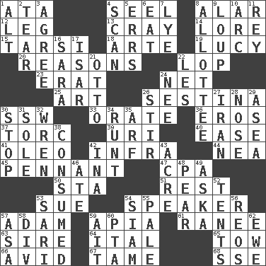ACROSS 1. _ moment's notice (2 wds.) 4. Stitch closed the eyes of (a falcon) 8. Having or resembling wings 12. Part of a journey 13. Supercomputer manufacturer 14. Old wives' tales, e.g. 15. Tarsus (plural) 18. Johnson of "Laugh-In" 19. "I Love _" 20. Thinks logically 22. Chop off 23. Part of Q.E.F. 24. Fish or hair follower 25. Nonscientific branch of learning 26. French poetic form 30. Compass dir. 33. Speak pompously 36. Greek god of love 37. Torque (variant) 39. RI univ. 40. Comfort 41. Margarine 42. Kind of red light 44. Teachers' org. 45. Pre-World Series prize 47. Accounting whiz (abbr.) 50. R.R. building 51. Remainder 53. Take to court 54. Orator 57. First of billions? 59. Capital of Western Samoa 61. The wife of a rajah (variant) 63. The founder of a family 64. Slanted text style (abbr.) 65. Pull behind 66. Enthusiastic 67. Not wild 68. Compass dir. DOWN 1. The first octave above the treble staff 2. Pull into pieces 3. Match 4. Skim 5. Blunders 6. Consume 7. Potassium hydroxide 8. One to whom something is allotted 9. Central Nebraska county 10. Curve 11. Marina Del _, California 16. "Two Mules for Sister ____" 17. Austrian river, tributary to the Danube 21. "Beetle Bailey" pooch 22. French article 24. Born 26. Agitate 27. SW Asia republic 28. Olfactory organ 29. At sea 30. Close up, plug up 31. Not divided or shared with others 32. Songbird 34. The smallest animal of a litter 35. Sandy's bark 38. Ingested 42. _ tizzy (2 wds.) 43. Measure of real estate 46. Had dinner 48. Lightbulb-shaped fruit 49. "____ silly question..." 52. Portable shelters 53. Indian skirt 54. Thailand, formerly 55. Light colored 56. Vintage cars 57. White ___ sheet 58. HTML Container Element 59. Small island 60. Parent Teacher Association (abbr.) 62. She-sheep