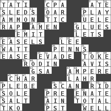 ACROSS 1. Jacques of French films 5. Accounting whiz (abbr.) 8. Had dinner 11. Bobsleighs 13. Rowing implement 14. Shaw product 15. ID or VA city 16. Nervous spasm 17. Ubangi River tributary 18. Reproach for some lapse or misdeed 19. So be it 21. Adhesives 22. Send forth 24. Allows 25. Artist's stands 27. Area sheltered from the wind 29. Electrical Unit 30. Actor Sean's family 32. Relaxation 33. Elude 35. Puff or smoke 39. "The Thinker" sculptor 41. Deliberation 42. Girls' org. (abbr.) 43. Electrical Unit 45. Burn to charcoal 48. Cowardly lion portrayer 49. First-year military academy student 50. Examine minutely or intensely 52. To free from 55. Not divided or shared with others 56. Before (prefix) 57. Maternal 59. Table seasoning 60. The 18th letter of the Arabic alphabet 61. Add up to 62. Ring climax 63. Pacific Standard Time (abbr.) 64. Not ill DOWN 1. Russian ruler of old 2. _ mater 3. Storms 4. Wedding promise 5. ____ d'Azur (French Riviera) 6. Ache 7. Curve 8. Native American of Southwest Alaska 9. Lies 10. Sight organs 12. Slow-paced one 14. Whine 20. Mountains (abbr.) 21. Small, secluded valley 23. Distance measurement 25. She-sheep 26. Auto club (abbr.) 27. Directed 28. Compass dir. 30. Baking dish 31. Staphylococcus 33. Begley and Asner 34. By way of 36. Make much ado about nothing 37. Apertif with cassis 38. Compass dir. 40. Legendary monster 43. In the manner of 44. French painter Edouard 45. Anything that covers or conceals 46. Phone greeting 47. Collude with 49. Inconspicuous attention getter 50. Indian titles of respect 51. Penny 53. Slanted text style (abbr.) 54. Small valley 56. Infant food 58. At this time