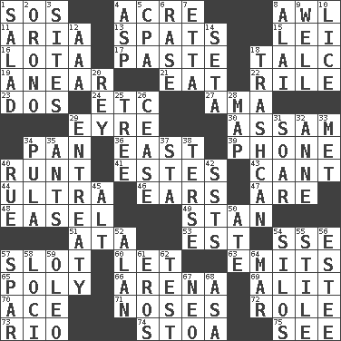 ACROSS 1. Mayday 4. Measure of real estate 8. Leather borer 11. Operatic vocal solo 13. Arguments over trivial matters 15. Luau accessory 16. Globular water bottle used in Asia 17. Thick mixture 18. Baby powder 19. Approach 21. Erode 22. Cause heat under the collar 23. Two (Sp.) 24. And so on (abbr.) 27. Wet nurse (var.) 29. Jane of fiction 30. Indian state 34. Baking dish 36. Compass direction 39. Give a jingle 40. Undersized animal 41. _____ Park, CO 43. Patter 44. Extremist 46. Hearing organs 47. "We ___ not amused" (Victoria) 48. Artist's stand 49. Comedian Laurel of Laurel & Hardy 51. _ moment's notice (2 wds.) 53. Eastern Standard Time (abbr.) 54. Compass dir. 57. Narrow opening 60. Allow 63. Gives off 65. Much (prefix) 66. Sports stadium 69. Set down 70. Adept person 71. Olfactory organs 72. Hero or heavy, e.g. 73. _ de Janeiro 74. Portico 75. Perceive with the eye DOWN 1. Vegetable dish 2. U. of Maine site 3. Settings 4. Cleo's killer 5. Numbers guy (abbr.) 6. Raze (variant) 7. Singer James 8. Mountain range southwest of Kyrgyzstan 9. Water source 10. Louse (plural) 12. American Automobile Association (abbr.) 14. Stalk of a moss capsule 18. File 13 20. Marina Del _, California 25. Family _ (genealogy) 26. Desist 28. Atlas unit 29. Plea 31. Fly high 32. Queen of England 1702-14 33. Was introduced to 34. Monetary unit of Botswana 35. Pismires 37. R.R. building 38. Laconic 40. Sorrow 42. Fast planes 45. The first octave above the treble staff 50. Had dinner 52. Actor Alda or Thicke 54. Grain storage towers 55. Vertical member of a panel or frame 56. First name in cosmetics 57. Practice fight 58. Event scenes 59. Margarine 61. Greek god of love 62. Trial 64. Impair 67. Modern: prefix 68. White ___ sheet