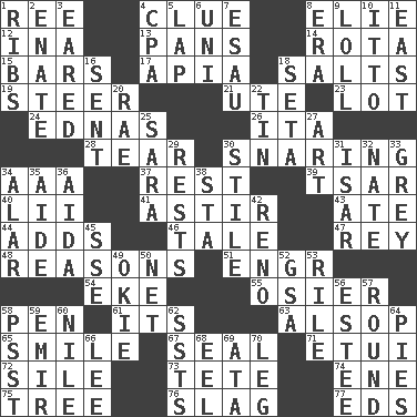 ACROSS 1. Portuguese money of account (variant) 4. A slight indication 8. Writer Wiesel 12. _ tizzy (2 wds.) 13. Zero-star reviews 14. Roll call or roster of names 15. Soap units 17. Capital of Western Samoa 18. Table seasonings 19. Bull 21. Shoshoni 23. Car dealer's back yard 24. Ferber et al. 26. Call ___ day 28. Separate forcefully 30. Catching in a trap 34. American Automobile Association (abbr.) 37. Remainder 39. Russian ruler of old 40. Cards in a Roman deck? 41. Moving about 43. Had dinner 44. Sums up 46. Falsehood 47. Marina Del _, California 48. Thinks logically 51. Engineer (abbr.) 54. Supplement with great effort 55. Flexible twig of a willow tree 58. Animal enclosure 61. ___ a Wonderful Life 63. Columnist Joseph or Stewart 65. Grin 67. Lick closed 71. Needle holder 72. Drop; flow; fall 73. False hair 74. Compass dir. 75. Woody plant 76. Volcanic refuse 77. Begley and Asner DOWN 1. Chest bones 2. Maternal 3. Having ears or earlike features 4. Tax preparer (abbr.) 5. Infant locale 6. University (slang) 7. He sold his birthright 8. Epoch 9. Hang loosely or laxly 10. "Tell ____ the Marines!" 11. Compass direction 16. Emitted 18. Stalk of a moss capsule 20. Actress Charlotte 22. Metal container 25. "Two Mules for Sister ____" 27. Tate display 29. Musical pauses 30. Vertical member of a panel or frame 31. Austrian river, tributary to the Danube 32. Nathan's nickname 33. Jennifer or Joel 34. Having or resembling wings 35. Helper 36. Opera by Verdi 38. R.R. building 42. Western Nevada city 45. Compass dir. 49. Migrant worker of the '30s 50. Fish or hair follower 52. Girls' org. (abbr.) 53. Cause heat under the collar 56. First name in cosmetics 57. Unit of ammunition 58. Inconspicuous attention getter 59. Independent ruler or chieftain 60. "Death on the ____" 62. Fast planes 64. Sliced desserts 66. Area sheltered from the wind 68. Snakelike fish 69. "One Day ___ Time" 70. Part of a journey