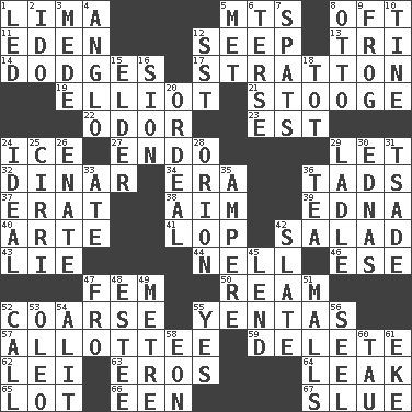 ACROSS 1. Pale green bean 5. Mountains (abbr.) 8. Often (poetically) 11. Locale of original sin 12. Ooze 13. Three (prefix) 14. Evades 17. Ski resort town in Vermont 19. American author Paul (1891-1958) 21. Moe Howard, for one 22. Aroma 23. Eastern Standard Time (abbr.) 24. Frozen water 27. Inside; within (prefix) 29. Allow 32. Middle Eastern gold or silver currency 34. Period 36. Bits 37. Part of Q.E.F. 38. Direct toward a target or goal 39. Pulitzer Prize-winning author Ferber 40. Johnson of "Laugh-In" 41. Chop off 42. First course 43. Whopper 44. 1994 drama film starring Jodie Foster 46. Compass dir. 47. Opposite of masc. 50. 480, 500 or 516 sheets of paper 52. Unrefined 55. Gossips 57. One to whom something is allotted 59. Erase 62. Luau accessory 63. Greek god of love 64. Path through which fluid escapes 65. Car dealer's back yard 66. Car or cant ending 67. Change direction abruptly DOWN 1. Directed 2. Wedding promise 3. Ancient Persian 4. White American of non-Hispanic descent 5. Was introduced to 6. Laconic 7. Arguments over trivial matters 8. Von Bismarck 9. Tree-dwelling hopper 10. Prong on a fork 12. Fast jet (abbr.) 15. A person who is older than you are 16. The Jewish people; Israel 18. Small child 20. Severe or trying experience 24. Standard of perfection 25. High-altitude cloud 26. Maternal 28. Constellation of myth 29. Dipping utensil 30. Ferber et al. 31. Sadhe (variant) 33. Had dinner 35. Electrical Unit 36. Beverage made from leaves 42. Chalkboard 45. Grant temporary use of 47. Back 48. First name in cosmetics 49. Distance measurement (Brit.) 51. Promenades 52. Give a ring to 53. Margarine 54. Came down and settled, as after flight 55. Consenting reply 56. Sew up the eyelids of hawks and falcons 58. A really long time 60. The 19th letter of the Greek alphabet 61. Make supply last