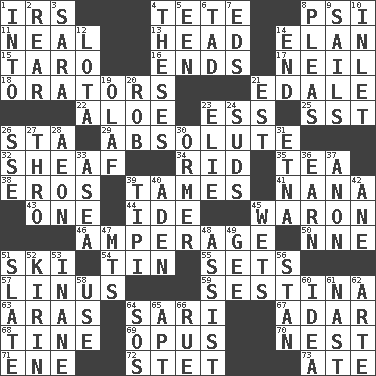 ACROSS 1. Big collection agency 4. False hair 8. 23rd letter of the Greek alphabet 11. Be tempered by heat 13. Froth on beer 14. Flair 15. Pacific island yam 16. Conclusions 17. Famous astronaut Armstrong 18. Speakers 21. Peak District village in England 22. _ vera 23. Curvy letter 25. Fast jet (abbr.) 26. R.R. building 29. Utter; complete 32. To gather and bind into a bundle 34. To free from 35. Afternoon social gathering 38. Greek god of love 39. Makes less strong or intense 41. Grandmother 43. Single 44. Binary compound 45. Make _____ (do battle with) 46. Electrical Measurement 50. Compass dir. 51. What Jean-Claude Killy likes to do 54. Metal container 55. Puts into a specified state 57. "_ and Lucy" (Charlie Brown theme song) 59. French poetic form 63. Caspian sea tributary 64. Indian skirt 67. The sixth month of the Jewish calendar 68. Prong on a fork 69. Musical composition 70. A home for chicks 71. Compass dir. 72. Proofreading order 73. Had dinner DOWN 1. To the inside or interior of 2. Hitchcock's "____ Window" 3. "Two Mules for Sister ____" 4. College papers 5. Car or cant ending 6. Small amount or degree 7. Begley and Asner 8. Entreaties 9. Travel by water 10. An arm off of a larger body of water 12. Globular water bottle used in Asia 14. Conclude 19. Norwegian king 20. Director Reiner 21. Eastern Standard Time (abbr.) 23. Writer Wiesel 24. Beer foam 26. Compass dir. 27. Through, poetically 28. A really long time 30. Channel Islands abalone 31. Inactive volcano in Sicily 33. At sea 36. Merit 37. At once, immediately (arch.) 39. Native american tent (variation) 40. Arabian gulf 42. One (Scot) 45. Moistens 47. Mountains (abbr.) 48. Aid 49. Turn to the right 51. Chalkboard 52. Japanese brewing company 53. Silly 56. Comedian Laurel of Laurel & Hardy 58. Purpose 60. The content of cognition 61. Political cartoonist Thomas 62. Johnson of "Laugh-In" 64. Mayday 65. Fitting 66. Regret