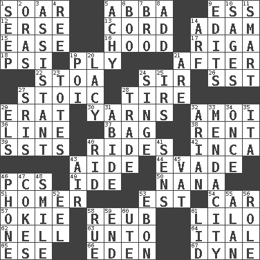 ACROSS 1. Fly high 5. Swedish rock group 9. Curvy letter 12. Celtic language 13. Drawstring 14. First of billions? 15. Relaxation 16. Parka part 17. Capital of Latvia 18. Air pressure measure (abbr.) 19. Apply oneself diligently 21. Following 22. Portico 24. Title for a knight 26. Fast jet (abbr.) 27. Unemotional 28. Become fatigued 29. Part of Q.E.F. 30. Entertaining tales 32. Mine, in Marseilles 36. Actor's bit 37. Container for groceries 38. Monthly bill 39. Fast planes 40. Amusement-park features 42. South American Indian 43. Helper 44. Dodge 46. Personal Computers (abbr.) 49. Binary compound 50. Grandmother 51. Simpsons dad 53. Eastern Standard Time (abbr.) 54. Auto 57. Migrant worker of the '30s 58. Reuben's nickname 61. _ and Stitch 62. 1994 drama film starring Jodie Foster 63. To (old English) 64. Slanted text style (abbr.) 65. Compass dir. 66. Genesis locale 67. Unit of force DOWN 1. Ooze 2. Mouths or openings 3. Aide 4. To separate or throw off 5. Painful 6. Oct. 31 cry 7. Sis' sibling 8. Increase 9. Prepares for publication 10. Gurus 11. Don Adams' spy role 14. Sandy's bark 19. Luau course 20. Made of lace 21. "We ___ not amused" (Victoria) 23. Lugs 24. Scorch 25. Big collection agency 27. Indian titles of respect 28. Buy and sell 29. Raised railways 31. Tolerate 32. Believer in; advocate of (suffix) 33. Ananias' fault 34. Single time 35. Call ___ day 40. To free from 41. Elected reps. 43. Atmosphere 45. Large container 46. Give a jingle 47. Popular sodas 48. Grin 52. Snakelike fish 53. Inky black, to poets 55. ____ Jay Lerner 56. Hero or heavy, e.g. 58. Regret 59. Conclude 60. Shoshoni 61. Hat (slang)