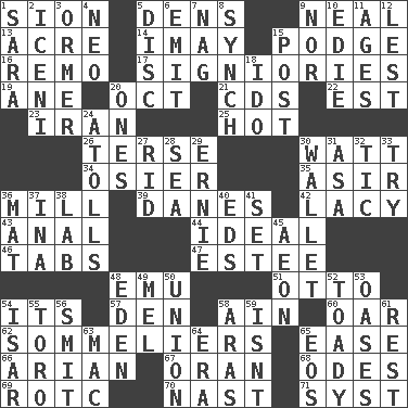 ACROSS 1. The Jewish people; Israel 5. Habitations of wild animals 9. Anneal 13. 43,560 square feet 14. "If ____ say so..." 15. Puddle 16. San ____ (Riviera town) 17. Seigniories (variant) 19. One (Scot) 20. Sep. follower 21. Music discs 22. Eastern Standard Time (abbr.) 23. SW Asia republic 25. Being at a high temperature 26. Laconic 30. Electrical Unit 34. Flexible twig of a willow tree 35. SW Saudi Arabia district 36. Place where flour is made 39. Natives or inhabitants of Denmark 42. Made of lace 43. Of or related to the anus 44. Standard of perfection 46. Bar bills 47. First name in cosmetics 48. Australian flightless bird 51. "Beetle Bailey" pooch 54. ___ a Wonderful Life 57. Lair 58. The 18th letter of the Arabic alphabet 60. Rowing implement 62. Wine waiters 65. Comfort 66. Believer in; advocate of (suffix) 67. Northwest Algerian city 68. Lyric poems 69. College mil. group 70. Political cartoonist Thomas 71. System (abbr.) DOWN 1. "Two Mules for Sister ____" 2. Ancient Celtic tribe of eastern Britain 3. Channel Islands abalone 4. Modern: prefix 5. Compact _ 6. Give off 7. Tired old horse 8. Synchronize (abbr.) 9. Or not 10. Singer Brickell 11. Grows older 12. For fear that 15. Mail 18. Wedding promise 20. Singles 24. Ringlike coral islands and reefs 27. To free from 28. Ocean 29. Bert's buddy 30. Place for singles 31. White ___ sheet 32. Nervous spasm 33. Attempt 36. Floor covering 37. _ tizzy (2 wds.) 38. Experiment locale 40. Begley and Asner 41. Put into a specified state 45. Period of immesurable duration 48. Genesis locale 49. Cartoonist voice _ Blanc 50. The state of being joined or united 52. Sycophant 53. Fertile tracts in a desert 54. Austrian river, tributary to the Danube 55. "Corrida" creature 56. Stricken, poetically 58. Ancient river in northeast Turkey 59. Is not 61. Repose 63. Apple computer (short form) 64. Period 65. Greek goddess of the dawn