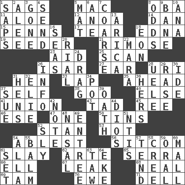 ACROSS 1. Sinks 5. Big _ 8. Chief or king in Benin or Nigeria 11. _ vera 12. Small Philippine buffalo 14. One of the 12 tribes of Israel 15. Actor Sean's family 17. Pull apart 18. Pulitzer Prize-winning author Ferber 19. Sowing specialist 21. Full of chinks, cracks, or crevices 23. Assist 25. Examine minutely or intensely 26. Austrian river, tributary to the Danube 27. Ewer handle 28. RI univ. 31. Layer 33. Infant locale 35. Having the leading position 37. Automatically 38. Thick or sticky substance 40. Otherwise 41. The state of being joined or united 43. Small amount or degree 45. To riddle 46. Compass dir. 47. Single 50. Canisters 52. Comedian Laurel of Laurel & Hardy 53. Being at a high temperature 54. Most capable 56. "Cheers" or "Ellen" 61. Kill 62. Johnson of "Laugh-In" 65. Spanish missionary in California 66. Pipe bend 67. Path through which fluid escapes 68. Actress Patricia 69. Scottish cap 70. She-sheep 71. Small valley DOWN 1. Plant excrements 2. Toward shelter 3. Went 4. Transmit 5. Floor protector 6. One (Scot) 7. Rough 8. Probability 9. Object of repulsion 10. Santa ___, CA 13. N. Chile seaport 16. Oceans 18. Age 20. Monetary unit of Yemen 22. Hindu Mythology: god of death 24. To trail on the ground 26. Information 28. Ubangi River tributary 29. Raze (variant) 30. Binary compound 31. Coop moms 32. Writer Wiesel 34. Cooking vessel 36. Possessive pronoun 37. Institute legal proceedings 39. Pledge 42. Musical sound 44. "Vaya con ____" 48. Rhinal 49. Main course 51. Nuclear Threat Initiatives 52. Mischievous 54. Silent film actress Nazimova 55. Lip ointment 57. Watch over 58. Algonquian 59. Spoken 60. Promenade 61. Arrange properly for use 63. The 23rd letter of the Hebrew alphabet 64. Make supply last