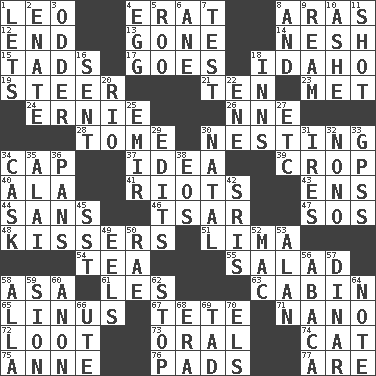 ACROSS 1. Lion 4. Part of Q.E.F. 8. Ancient river in northeast Turkey 12. Conclusion 13. Went 14. Tender 15. Bits 17. Travels 18. Potato state 19. Bull 21. "___ Little Indians" 23. Was introduced to 24. Bert's buddy 26. Compass dir. 28. Heavy book 30. Nestling 34. Head covering 37. It may be bright or harebrained 39. Riding implement 40. Wing 41. Disturbances 43. Followers of ems 44. Without 46. Russian ruler of old 47. Mayday 48. Smoochers 51. Pale green bean 54. Beverage made from leaves 55. Vegetable dish 58. White ___ sheet 61. French article 63. Apartment or room in a ship 65. "_ and Lucy" (Charlie Brown theme song) 67. Wig 71. Billionth: prefix 72. Spoils 73. Of the mouth 74. Domesticated feline 75. Singer Murray 76. Writing tablets 77. "We ___ not amused" (Victoria) DOWN 1. Allows 2. Related on the mother's side 3. More peculiar 4. Oval reproductive body of a fowl 5. Friend of Pooh 6. One (Scot) 7. Trial 8. Plus 9. 480, 500 or 516 sheets of paper 10. American tennis player Robert 11. Went for two points 16. Emitted 18. Lodging establishments 20. _ de Janeiro 22. Compass dir. 25. Arab leader 27. And so on (abbr.) 29. Prepares for publication 30. Brizilian seaport 31. Angers 32. Words to Nanette 33. Global Positioning Systems (abbr.) 34. Keg 35. Jai ____ 36. Zero-star reviews 38. Greek goddess of the dawn 42. Indian titles of respect 45. Fast jet (abbr.) 49. Snakelike fish 50. Actress Charlotte 52. Big _ 53. Actor Alda or Thicke 56. Phillipine bananalike plant 57. Middle Eastern gold or silver currency 58. Silent film actress Nazimova 59. The Jewish people; Israel 60. Soon (poet.) 62. Close up, plug up 64. Make mention of 66. Shoshoni 68. Period 69. Small amount or degree 70. Raised railways