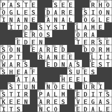 ACROSS 1. Thick mixture 6. Observe 9. 17th letter of the Greek alphabet 12. Stares at amorously 13. Have the gumption 14. The Jewish people; Israel 15. Silly 16. Of or related to the anus 17. Stare 18. It would 19. System (abbr.) 20. Unable to walk 21. Greek god of love 23. Mouth or opening 24. Genesis locale 25. Laconic 28. Male child 30. Having ears or earlike features 34. Dormintory (informal) 35. Choose 36. The wife of a rajah (variant) 38. Cards in a Roman deck? 39. Armed conflicts 41. Ferber et al. 43. Eastern Standard Time (abbr.) 44. Archer's quiver 46. Takes to court 48. _ moment's notice (2 wds.) 49. Person who is morally reprehensible 50. Make senseless or dizzy 51. Christmas carol 53. RI univ. 56. Use a spoon 57. Inside of hand 58. Proofreads 60. Peachy ____! 61. Ancient Greek god of war 62. Viva Las _ 63. ___ a Wonderful Life 64. Non-commissioned officer (abbr.) 65. Peak District village in England DOWN 1. Luau course 2. Hindu god of fire 3. Narrow board 4. Watched over 5. Compass dir. 6. Without 7. Part of Q.E.F. 8. Snakelike fish 9. Frustrating wastes of time 10. Opening into or through something 11. Single 13. 24-hour periods 14. Flew 19. Underwater navigation system 20. Car dealer's back yard 22. Portuguese money of account (variant) 24. Pleas 26. Indian titles of respect 27. Give off 28. Sty mamas 29. Brightly colored fish 31. Actress Charlotte 32. Conclude 33. Lair 37. Artist's stand 40. Titan orbits this 42. Institute legal proceedings 45. Avid follower 47. Evaded 49. Folds over and sews together 50. Proofreading order 51. Drug cop 52. Butter sub 54. Capital of Latvia 55. Slanted text style (abbr.) 56. What Jean-Claude Killy likes to do 57. Baking dish 58. First lady 59. Compass dir.