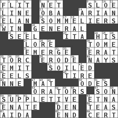 ACROSS 1. Sudden quick movement 5. Fish or hair follower 8. _ gin 12. Actor's bit 13. Chief or king in Benin or Nigeria 14. Believer in; advocate of (suffix) 15. Enthusiasm 16. Wine waiters 19. Victory 20. Commissioned military rank 21. Stitch closed the eyes of (a falcon) 23. Call ___ day 24. Part of HMS, perhaps 27. Old wives' tales, e.g. 30. Heavy book 31. Develop 34. Part of Q.E.F. 35. Torque (variant) 38. Eat (away) 40. Negative votes 41. Give off 42. Dirtied 44. Snakelike fish 45. Become fatigued 46. Compass dir. 47. Floor protector 50. Lyric poems 53. Speakers 57. Male offspring 59. Supplementary 63. Inactive volcano in Sicily 64. Maternal 65. Lair 66. Afternoon social gatherings 67. Opera by Verdi 68. Conclusion 69. Certainty DOWN 1. Soared 2. Ms. Damita and namesakes 3. Silly 4. Nine, plus one 5. Olfactory organ 6. Inky black, to poets 7. Not wild 8. Indian title of respect (Mr.) 9. Untruth 10. Rowing implement 11. Followers of ems 14. Silent film actress Nazimova 17. Medical imaging device (abbr.) 18. Ingest 20. Take by theft 22. Chooses 24. Israeli folk dance 25. "If ____ say so..." 26. Puts into a specified state 28. Portuguese money of account (variant) 29. Blunders 30. Watched over 32. Thick or sticky substance 33. Prepare for publication 35. Adolescent 36. Sign of things to come 37. Cause heat under the collar 39. Connecticut Ivy Leaguer 43. Greek god of love 47. Undercover agent 48. "We ___ not amused" (Victoria) 49. Make lace 51. First name in cosmetics 52. Echolocation 54. Periodic rise and fall of the sea level 55. Baking chamber 56. Tear apart 58. Political cartoonist Thomas 59. Ocean 60. University (slang) 61. Groovy apt. 62. Parent Teacher Assoc. 63. And so on (abbr.)