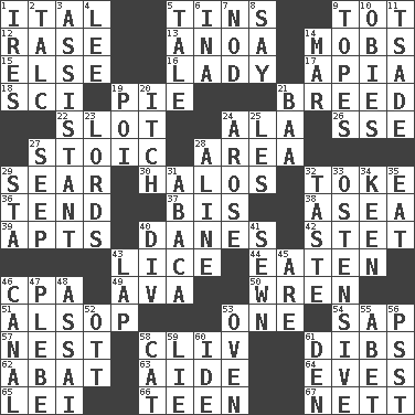 ACROSS 1. Slanted text style (abbr.) 5. Airtight sealed metal containers 9. Small child 12. Raze (variant) 13. Small Philippine buffalo 14. Crowds into 15. Otherwise 16. Kenny Rogers chart-topper in '80 17. Capital of Western Samoa 18. _-fi 19. Sliced dessert 21. A special lineage 22. Notch 24. Wing 26. Compass dir. 27. Unemotional 28. Length times width 29. Burn superficially 30. Auras 32. Puff or smoke 36. Be inclined (to) 37. Twice 38. Toward the sea 39. Flats, for short 40. Natives or inhabitants of Denmark 42. Proofreading order 43. Louse (plural) 44. Eroded 46. Tax preparer (abbr.) 49. Actress Gardner 50. Songbird 51. Columnist Joseph or Stewart 53. Single 54. Plant excrement 57. A home for chicks 58. 154 in Roman numerals 61. Claim 62. Blind as ____ 63. Assistant 64. Nights before holidays 65. Flowery wreath 66. Adolescent 67. Remaining after all deductions DOWN 1. Angers 2. Baby powder 3. Aide 4. Area sheltered from the wind 5. Falsehood 6. _ tizzy (2 wds.) 7. Dreamland 8. Declare 9. Drinks excessively 10. Off-Broadway awards 11. Sadhe (variant) 14. Impair 19. Luau course 20. Hankering 21. Sound made by sheep 23. Nobles 24. Came up 25. French article 27. Ooze 28. Place in a line 29. R.R. building 31. Phillipine bananalike plant 32. Clothes sense 33. Clearly or manifestly demonstrative 34. Peachy ____! 35. Consume 40. HTML Container Element 41. Stitched 43. Pet locale 45. "We ___ not amused" (Victoria) 46. Lessep's creation 47. First-year military academy student 48. Slender Brazilian palm 52. Baseball player Mel 53. Baking chamber 55. Collude with 56. Inconspicuous attention getter 58. Feline 59. Whopper 60. Binary compound 61. Lair