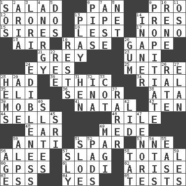 ACROSS 1. Vegetable dish 6. Baking dish 9. Adept person 12. U. of Maine site 13. Corncob 14. Angers 15. Fathers 16. For fear that 17. Words to Nanette 18. Atmosphere 19. To erase 20. Open wide 21. Jennifer or Joel 23. Single; one (prefix) 24. Sight organs 25. Distance measurement (Brit.) 28. Possessed 30. Value system 34. Monetary unit of Yemen 35. Biblical high priest 36. Sir (Sp.) 38. "One Day ___ Time" 39. Disorderly crowds 41. Brizilian seaport 43. "___ Little Indians" 44. Makes a sale 46. Cause heat under the collar 48. Hearing organ 49. Ancient Persian 50. Against 51. Practice fight 53. Compass dir. 56. Toward shelter 57. Volcanic refuse 58. Add up to 60. Global Positioning Systems (abbr.) 61. Farming town in central California 62. Ascend 63. Double-curved letter 64. Consenting reply 65. Trials DOWN 1. Mayday 2. Operatic vocal solo 3. Australian parrot (variant) 4. Disorder of the immune system 5. Two (Sp.) 6. Sliced desserts 7. Domed church section 8. Fish or hair follower 9. Appease 10. French philosopher Descartes 11. Bear (Spanish) 13. Shaw product 14. Sillier 19. Musical pauses 20. Chewing product 22. Portuguese money of account (variant) 24. The property of being fit to eat 26. Assign a rank or rating to 27. Flair 28. Is hesitant and indecisive 29. _ vera 31. Layer 32. _ tizzy (2 wds.) 33. Small bed 37. More uncommon 40. Chalkboards 42. Hat (slang) 45. Indian title of respect (Mr.) 47. Poe poem 49. Wise men 50. High mountains 51. A type of plum 52. Writing tablets 54. Nuclear Threat Initiatives 55. 90 degrees 56. Personal question 57. Mischievous 58. Make lace 59. French article