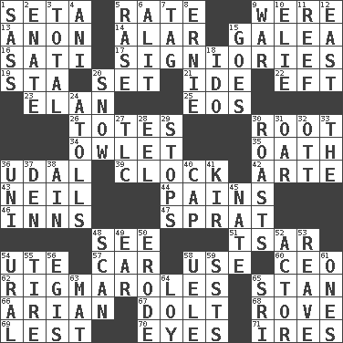 ACROSS 1. Bristle 5. Pace 9. Past tense of be (plural) 13. At once, immediately (arch.) 14. Having or resembling wings 15. An organ shaped like a helmet 16. Suttee (variant) 17. Seigniories (variant) 19. R.R. building 20. Put into a specified state 21. Binary compound 22. Lizard (obsolete) 23. Liveliness 25. Greek goddess of the dawn 26. Hauls 30. Carrot, for example 34. A small or young owl 35. Pledge 36. Hereditary estate 39. Timepiece 42. Johnson of "Laugh-In" 43. Famous astronaut Armstrong 44. Aches 46. Lodging establishments 47. Small fatty European fish 48. Observe 51. Russian ruler of old 54. Shoshoni 57. Automobile 58. Purpose 60. Corporate head (abbr.) 62. Complicated, petty procedures 65. Comedian Laurel of Laurel & Hardy 66. Believer in; advocate of (suffix) 67. Dunce 68. Be footloose 69. For fear that 70. Sight organs 71. Angers DOWN 1. Backtalk 2. Maternal 3. "_____ Recall" 4. Black tropical American cuckoo 5. To erase 6. Came down and settled, as after flight 7. Label 8. Bert's buddy 9. Armed conflict 10. Writer Wiesel 11. Coral collection 12. 90 degrees 15. Travels 18. Wedding promise 20. Overwhelm 24. Ringlike coral islands and reefs 27. Affectionate concern, for short 28. Snakelike fish 29. Ceases 30. Ridicules or criticizes harshly 31. Rowing implement 32. Baseball player Mel 33. Definite Article 36. Corn or form start 37. Lair 38. The 18th letter of the Arabic alphabet 40. Head covering 41. Apertif with cassis 45. Nathan's nickname 48. Skim 49. Hearing organ 50. Wear away 52. Thespian 53. Break or tear apart 54. Mountain range 55. Become fatigued 56. Armor plate that protects the chest 58. Ubangi River tributary 59. Fast planes 61. Singles 63. Floor covering 64. Myrna of the movies 65. Indian title of respect (Mr.)