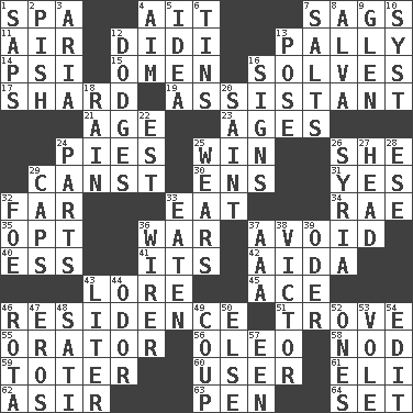 ACROSS 1. Health resort 4. Small island 7. Droops 11. Wind 12. "You Light Up My Life" star Conn 13. Friendly 14. Air pressure measure (abbr.) 15. Sign of things to come 16. Finds the solution 17. Pottery fragment 19. Aide 21. Ripen 23. Ripens 24. Sliced desserts 25. Victory 26. A female animal or person 29. 2nd pers. sing. pres. of can (arch.) 30. Followers of ems 31. Consenting reply 32. Distant 33. Ingest 34. Actress Charlotte 35. Choose 36. Armed conflict 37. Shun 40. Curvy letter 41. It is 42. Opera by Verdi 43. Old wives' tales, e.g. 45. Adept person 46. Dwelling 51. Collection of objects 55. Speaker 56. Margarine 58. Allow head to fall sleepily 59. Carrier 60. One who makes use of a thing 61. Connecticut Ivy Leaguer 62. SW Saudi Arabia district 63. Fenced enclosure 64. Arrange properly for use DOWN 1. Plant excrements 2. Expression of disdain 3. Roberta Peters solo 4. Direct toward a target or goal 5. The content of cognition 6. Canisters 7. Table seasonings 8. Inventor's middle name 9. Small, secluded valley 10. System (abbr.) 12. Evades 13. Introduce or present, as a question 16. Signals 18. Precipitation 20. Inhabitant of Heaven 22. Eastern Standard Time (abbr.) 24. Components 25. Puts on (as clothing) 26. Damascus' land 27. Froth on beer 28. Compass dir. 29. Balmoral and tarboosh 32. Enemy 33. Ingested 36. One who wires 37. American Automobile Association (abbr.) 38. Winning man's name 39. River in Europe 43. 61 cubic inches 44. Aroma 46. Round or rotation of duties 47. Greek god of love 48. Suttee (variant) 49. Overturn; upset 50. Otherwise 52. Singles 53. Grand slam 54. Prepare for publication 57. Car or cant ending