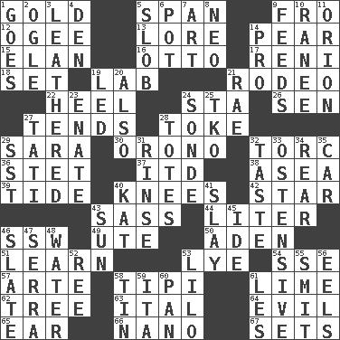 ACROSS 1. Gilt 5. Connect, as a bridge 9. Away 12. Double curve, resembling the letter S 13. Old wives' tales, e.g. 14. Lightbulb-shaped fruit 15. Style 16. "Beetle Bailey" pooch 17. Painter Guido (1575-1642) 18. Arrange properly for use 19. Experiment locale 21. Cowboy competition 22. Person who is morally reprehensible 24. R.R. building 26. Elected rep. 27. Watches over 28. Casino tip 29. "Two Mules for Sister ____" 30. U. of Maine site 32. Torque (variant) 36. Proofreading order 37. It would 38. Toward the sea 39. Event that recurs at intervals 40. Leg joints 42. Play the lead 43. Backtalk 44. 61 cubic inches 46. Compass dir. 49. Shoshoni 50. An important port of Yemen 51. Memorize 53. Sodium hydroxide 54. Compass dir. 57. Johnson of "Laugh-In" 58. Native american tent (variation) 61. Welles in "The Third Man" 62. Woody plant 63. Slanted text style (abbr.) 64. Morally bad or wrong 65. Hearing organ 66. Billionth: prefix 67. Arranges properly for use DOWN 1. Moves 2. Stare 3. Resembling or made to resemble leather 4. Lair 5. Oscar Madison type 6. Plant holder 7. Nonscientific branch of learning 8. Modern: prefix 9. Eats 10. The wife of a rajah (variant) 11. Constellation of myth 14. Adept person 19. Directed 20. In addition 21. Actress Charlotte 23. Maternal 24. Message 25. Ring climax 27. Jacques of French films 28. Hauls 29. Fast jet (abbr.) 31. Wash lightly 32. Clothes sense 33. Clearly or manifestly demonstrative 34. Bring up, as a child 35. Auto 40. Krazy ___ of comics 41. Kill 43. Player for Phoenix 45. Binary compound 46. Schedule 47. Spanish missionary in California 48. Wetness 52. Portuguese money of account (variant) 53. _ and Stitch 55. Stricken, poetically 56. Snakelike fish 58. Shallow baking pan 59. Call ___ day 60. Baking dish 61. French article