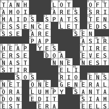 ACROSS 1. Hyperbolic tangent 5. Car dealer's back yard 8. Often (poetically) 11. Mine, in Marseilles 12. Ancient Greek god of war 14. _ Lanka 15. Unmarried girls 17. Arguments over trivial matters 18. "___ Little Indians" 19. Gist 21. Allow 22. Begley and Asner 23. Compass dir. 24. "We ___ not amused" (Victoria) 25. Elected rep. 27. Infant food 28. SW Saudi Arabia district 31. Pile 35. Affirmative reply 37. Become fatigued 38. Celtic language 39. ___ good deed 41. Nights before holidays 42. Political cartoonist Thomas 43. Compass dir. 45. Egg locale 46. Agitate 47. Biblical high priest 49. Mayday 51. River (Sp.) 52. Followers of ems 55. Fish or hair follower 57. Single 60. Commissioned military rank 62. Mouth or opening 63. Containing lumps 65. Before Barbara or Clara 66. Spanish title 67. Prepare for publication 68. Thailand, formerly 69. Eastern Standard Time (abbr.) 70. Epoch 71. Snakelike fish DOWN 1. Softens 2. Collect or gather 3. Annoying sound 4. Flintstone garb 5. Infant locale 6. Spoken 7. Wig 8. Clearly or manifestly demonstrative 9. Flintstone 10. Airtight sealed metal containers 13. Fast planes 16. Fastener 17. Oozed 20. Supercomputer manufacturer 26. Consumed 29. Angers 30. Take ten 31. Coop moms 32. Part of Q.E.F. 33. Aide 34. Stone: prefix 36. Male offspring 40. Disorder of the immune system 44. Writer Wiesel 48. Charged particles 50. Not divided or shared with others 52. Bert's buddy 53. Brizilian seaport 54. Criticizes harshly 55. Connecting point 56. Greek god of love 58. Unadorned 59. Arab leader 61. Relaxation 64. Parent Teacher Assoc.