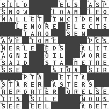 ACROSS 1. Grain storage tower 5. Raised railways 8. Cleo's killer 11. Frozen precipitation 12. Rich soil 13. Lion 14. Place for singles 17. Happening 19. Poe poem 21. Chooses 22. Edible starchy tuberous root 23. Elected rep. 24. "___ Maria" 27. Heavy book 29. Personal Computers (abbr.) 32. Haggard of country music 34. Begley and Asner 36. Set down 37. Hindu god of fire 38. Petroleum 39. Had on 40. Stated 41. R.R. building 42. Distance measurement (Brit.) 43. Compass dir. 44. Portico 46. Title for a knight 47. Parent Teacher Association (abbr.) 50. Singer James 52. A viewer who gazes fixedly 55. Michaelmas daisies 57. News announcer 59. Threatening words 62. It is 63. Filth; sediment 64. Common sense 65. Perceive with the eye 66. Snakelike fish 67. Collude with DOWN 1. Compass dir. 2. _ tizzy (2 wds.) 3. Hang loosely or laxly 4. A small or young owl 5. Age 6. Shoestrings 7. Grin 8. Actor Baldwin 9. Posted 10. Plant holders 12. Whopper 15. Maternal 16. "Corrida" creature 18. Lair 20. Lover boys 24. Collect or gather 25. Viva Las _ 26. Bert's buddy 28. Proofreads 29. Small pieces of grounds 30. High-altitude cloud 31. Bull 33. Flaplike covering 35. Chalkboards 36. Deep reverence 42. Mother 45. Von Bismarck 47. Adept person 48. Laconic 49. Nick name for Arthur 51. Sports stadium 52. Indian titles of respect 53. False hair 54. Domed church section 55. "We ___ not amused" (Victoria) 56. Oscar Madison type 58. Pipe bend 60. Institute legal proceedings 61. Eastern Standard Time (abbr.)