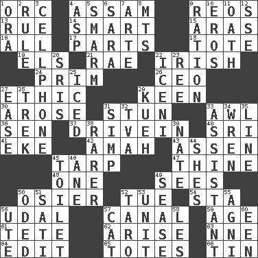 ACROSS 1. The grampus (Milton) 4. Indian state 9. Vintage cars 13. Sorrow 14. Don Adams' spy role 15. Ancient river in northeast Turkey 16. Everything 17. Actors' quests 18. Lug 19. Raised railways 21. Actress Charlotte 22. From or relating to Ireland 24. Demure 26. Corporate head (abbr.) 27. Value system 29. Peachy ____! 30. Came up 31. Surprise greatly 33. Leather borer 36. Elected rep. 37. Popular '50s hangout 40. Indian title of respect (Mr.) 41. Supplement with great effort 42. Wet nurse 43. NE Netherlands city 45. Canvas cover 47. One or ones belonging to thee 48. Single 49. Observes 50. Flexible twig of a willow tree 52. Third day of the wk. 54. R.R. building 56. Freehold land 57. Lessep's creation 59. Personal question 61. Wig 62. Get up 63. Compass dir. 64. Prepare for publication 65. Hauls 66. Metal container DOWN 1. Mouth or opening 2. General guideline 3. Portable communications device 4. Viper 5. Excessive but superficial compliments 6. "Two Mules for Sister ____" 7. Johnson of "Laugh-In" 8. Mountains (abbr.) 9. Food allowance for one day 10. Greek god of love 11. Pledge 12. Compass dir. 20. Indian titles of respect 22. Ancient Celtic tribe of eastern Britain 23. To separate or throw off 25. On the rocks 27. Comfort 28. Long journey 29. Malaysian steamed pastry 31. Simple or foolish person 32. Federal power corp. 33. Aide 34. Songbird 35. Actor's bit 38. More uncommon 39. Nathan's nickname 44. "______ My Girl" (Turtles hit) 45. Bathroom 46. One (Scot) 49. Gospel singer Marvin 50. Wrote a lyric poem 51. Suttee (variant) 52. Edible starchy tuberous root 53. A single undivided whole 55. Hindu god of fire 56. Shoshoni 57. Domesticated feline 58. French article 60. Car or cant ending