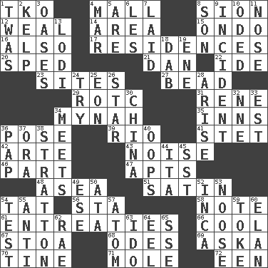 ACROSS 1. Ring climax 4. Promenade 8. The Jewish people; Israel 12. Welt 14. Length times width 15. Southwest Nigerian state 16. In addition 17. Dwellings 20. Moved rapidly 21. Daniel's nick name 22. Binary compound 23. Settings 27. Necklace unit 29. College mil. group 31. French philosopher Descartes 34. Non-adult bird? 35. Taverns 36. Introduce or present, as a question 39. _ de Janeiro 41. Proofreading order 42. Johnson of "Laugh-In" 43. Annoying sound 46. Role in a play 47. Flats, for short 48. Toward the sea 51. Smooth fabric 54. Make lace 56. R.R. building 58. Observe 61. Pleas 66. Calm and collected 67. Portico 68. Lyric poems 69. "____ silly question..." 70. Prong on a fork 71. Undercover agent 72. Car or cant ending DOWN 1. It was, poetically 2. Seaweed 3. Fertile tracts in a desert 4. Impair 5. "We ___ not amused" (Victoria) 6. French article 7. Put down 8. Male child 9. Happening 10. Wrote a lyric poem 11. Olfactory organ 13. Farming town in central California 18. Pat or tap gently 19. Compass dir. 24. Attempt 25. Age 26. Play the lead 28. Originate 30. Large country 32. Compass dir. 33. Eastern Standard Time (abbr.) 34. Confronts 36. Infant food 37. Mouth or opening 38. Ski resort town in Vermont 40. I made a mistake 44. Call ___ day 45. Fast jet (abbr.) 49. Compass dir. 50. _ moment's notice (2 wds.) 52. South American Indian 53. Trap for birds or small mammals 54. Trial 55. Against 57. Tiny particle 59. Puff or smoke 60. Liveliness 62. Actress Charlotte 63. Wedding promise 64. Snakelike fish 65. Compass dir.