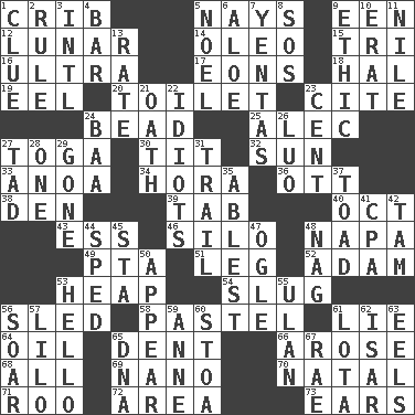 ACROSS 1. Baby bed with high sides 5. Negative votes 9. Car or cant ending 12. Type of eclipse 14. Margarine 15. Three (prefix) 16. Extremist 17. Immeasurably long periods of time 18. Actor Linden 19. Snakelike fish 20. Bathroom plumbing fixture 23. Quote 24. Necklace unit 25. Actor Baldwin 27. Ancient Roman robe 30. Teat (slang) 32. Player for Phoenix 33. Small Philippine buffalo 34. Israeli folk dance 36. Baseball player Mel 38. Lair 39. Keyboard key 40. Sep. follower 43. Double-curved letter 46. Grain storage tower 48. California wine valley 49. Parent Teacher Assoc. 51. Part of a journey 52. First of billions? 53. Pile 54. Strike heavily 56. Downhill vehicle 58. Soft color 61. Untruth 64. Lubricate 65. Gouge 66. Came up 68. 100% 69. Billionth: prefix 70. Relating to or accompanying birth 71. Friend of Pooh 72. Type of rug 73. Hearing organs DOWN 1. A slight indication 2. Governing power 3. International (abbr.) 4. Oblong piece of solid material 5. Christmas carol 6. Medicinal plant 7. Gossips 8. Distress signal 9. Moral principle 10. Part of Q.E.F. 11. The longest river in the world 13. Pace 21. Pledge 22. Foolish or stupid persons 23. Penny 24. Sound made by sheep 26. Nilotic language 27. Small amount or degree 28. Single 29. Went 31. Lag or linger behind 35. Most capable 37. Frog relative 41. Tax preparer (abbr.) 42. Scottish cap 44. Broke a traffic law 45. R.R. building 47. Stare at amorously 48. Tired old horse 50. Become visible 53. Phone greeting 55. ____ Bator 56. Fly high 57. _ and Stitch 59. Singer Murray 60. Portico 61. Globular water bottle used in Asia 62. Austrian river, tributary to the Danube 63. Snakelike fish 65. Heredity factor (abbr.) 67. Actress Charlotte