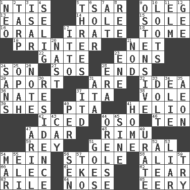 ACROSS 1. Nuclear Threat Initiatives 5. Russian ruler of old 9. Cassini of fashion 13. Relaxation 14. Opening into or through something 15. Flatfish 16. Relating to the mouth 17. Feeling or showing extreme anger 18. Heavy book 19. Hard copy producer 21. Fish or hair follower 22. Yard entry 23. Immeasurably long periods of time 24. Male offspring 27. Distress signal 28. Conclusions 29. To the left, to Queeg 31. "We ___ not amused" (Victoria) 32. The content of cognition 36. Nathan's nickname 37. Call ___ day 38. Short-tailed, large-bodied rat 39. "______ My Girl" (Turtles hit) 40. Parent Teacher Assoc. 41. Sun: prefix 42. On the rocks 44. Bear (Spanish) 46. Nine, plus one 47. The sixth month of the Jewish calendar 48. Tall New Zealand timber tree 50. Marina Del _, California 51. Commissioned military rank 54. Chow _ 56. Took without asking 58. Set down 60. Actor Baldwin 61. Supplements with great effort 62. Pull apart 63. Cause heat under the collar 64. Sense of smell 65. Suggestive of the supernatural DOWN 1. Modern: prefix 2. Canvas cover 3. Austrian river, tributary to the Danube 4. Former Milwaukee Brewers owner Bud 5. Triads 6. Fly high 7. Keyboard modifier key 8. To sift 9. Clearly or manifestly demonstrative 10. Plunders 11. Shade tree 12. Turn to the right 17. "Tell ____ the Marines!" 20. Political cartoonist Thomas 21. Lower and raise head in agreement 23. Compass dir. 24. Without 25. Brightly colored fish 26. Short letter 28. Epoch 30. Home 31. "One Day ___ Time" 33. Stupid person 34. Writer Wiesel 35. Period of immesurable duration 37. It would 40. For each 41. Dwelling 43. Island 44. Threatening words 45. Trig term 47. Satellite of Uranus 49. A salt of uric acid 51. Moves 52. Toward shelter 53. One who doesn't tell the truth 54. Third mo. 55. Connecticut Ivy Leaguer 56. Elected rep. 57. Ring climax 59. Attempt to accomplish something