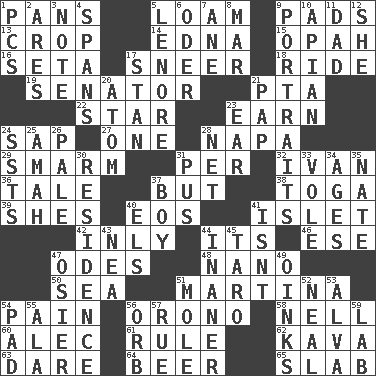 ACROSS 1. Baking dishes 5. Rich soil 9. Writing tablets 13. Riding implement 14. Pulitzer Prize-winning author Ferber 15. Brightly colored fish 16. Stalk of a moss capsule 17. Scornful expression 18. Travel on or in a vehicle 19. Legislator 21. Parent Teacher Assoc. 22. Play the lead 23. Merit 24. Plant excrement 27. Single 28. California wine valley 29. Excessive but superficial compliments 31. For each 32. "Terrible" tsar 36. Lie 37. With the exception that 38. Ancient Roman robe 39. "______ My Girl" (Turtles hit) 40. Greek goddess of the dawn 41. Small island 42. In an inward manner 44. It is 46. Compass dir. 47. Lyric poems 48. Billionth: prefix 50. Ocean 51. Chrissie's court nemesis 54. Ache 56. U. of Maine site 58. 1994 drama film starring Jodie Foster 60. Actor Baldwin 61. Court order 62. Polynesian shrub of the pepper family 63. Have the gumption 64. Fermented drink made from hops 65. Broad, flat, thick piece DOWN 1. Personal Computers (abbr.) 2. Ancient Greek god of war 3. Musical sound 4. Connects, as a bridge 5. Poe poem 6. River in Europe 7. A saturated hydrocarbon 8. Third mo. 9. Likenesses of persons 10. Bee-related 11. June honoree 12. A female animal or person 17. Comedian Laurel of Laurel & Hardy 20. Tiny particle 21. Infant food 23. Ewer handle 24. Fast planes 25. Housemaid 26. Diluted with white 28. Fish or hair follower 30. Home 31. Purulenc 33. Short-tailed, large-bodied rat 34. Eons 35. Nathan's nickname 37. Male child 40. Raised railways 41. Is not 43. Teachers' org. 44. More empty; more void 45. Pacific island yam 47. Flexible twig of a willow tree 49. Pig sounds 51. Undercover agent 52. Anneal 53. Inventor's middle name 54. Groovy apt. 55. According to 56. Globe 57. Regret 59. Experiment locale