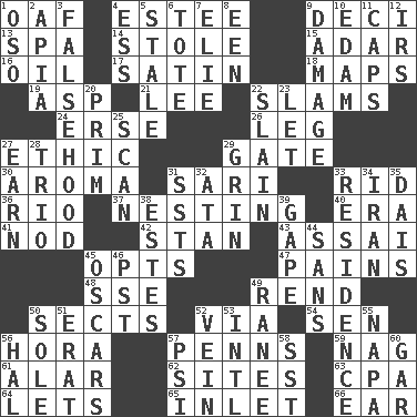 ACROSS 1. Clumsy lout 4. First name in cosmetics 9. Tenth: prefix 13. Health resort 14. Took without asking 15. The sixth month of the Jewish calendar 16. Lubricate 17. Smooth fabric 18. Atlas contents 19. Cleo's killer 21. Area sheltered from the wind 22. Criticizes harshly 24. Celtic language 26. Part of a journey 27. Value system 29. Yard entry 30. Scent 31. Indian skirt 33. To free from 36. _ de Janeiro 37. Inhabiting a nest 40. Epoch 41. Lower and raise head in agreement 42. Comedian Laurel of Laurel & Hardy 43. Slender Brazilian palm 45. Elects 47. Aches 48. Compass dir. 49. Tear apart 50. Religious groups 52. By way of 54. Elected rep. 56. Israeli folk dance 57. Actor Sean's family 59. Tired old horse 61. Having or resembling wings 62. Settings 63. Numbers guy (abbr.) 64. Allows 65. An arm off of a larger body of water 66. Hearing organ DOWN 1. Bear (Spanish) 2. Capital of Western Samoa 3. It jiggles the polygraph 4. Curvy letter 5. Showing deterioration from age 6. Carryall 7. Writer Wiesel 8. Car or cant ending 9. Break 10. Dutch treat 11. Balmoral and tarboosh 12. Big collection agency 20. Demure 22. Killed 23. Allow 25. Glance over 27. Merit 28. Musical group of three 29. Smile widely 31. Fast planes 32. "One Day ___ Time" 33. Home 34. SW Asia republic 35. Raised platform 38. _____ Park, CO 39. Open wide 44. Without 45. Motion picture awards 46. Pacific Standard Time (abbr.) 49. Indian princess (variant) 50. Not divided or shared with others 51. Part of Q.E.F. 52. Distinctive style or manner 53. International (abbr.) 55. California wine valley 56. Actor Linden 57. 23rd letter of the Greek alphabet 58. Fast jet (abbr.) 60. Slender fish