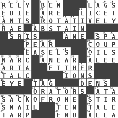 ACROSS 1. Trust 5. Benjamin's nick name 8. Fails to keep up a pace 12. Singer Brickell 13. "We ___ not amused" (Victoria) 14. It is permitted: Lat. 15. Pismires 16. Producing rotation 19. Actress Charlotte 20. Choose not to consume 21. Indian titles of respect 23. A saturated hydrocarbon 24. Health resort 27. Lightbulb-shaped fruit 30. Clever action or accomplishment 31. Artist's stands 34. Lubricates 35. Drug cop 38. Approach 40. Toward shelter 41. Operatic vocal solo 42. One or the other of two 44. Baby powder 45. Charged particles 46. Sight organ 47. Label 50. Lairs 53. Speakers 57. _ moment's notice (2 wds.) 59. Italian handbag shop? 63. Disorderly outburst 64. Slow-paced one 65. Nine, plus one 66. Falsehood 67. Canvas cover 68. Conclude 69. Silent film actress Nazimova DOWN 1. Rump 2. Ferber et al. 3. 61 cubic inches 4. Consenting reply 5. Sharp remark 6. Greek god of love 7. Remaining after all deductions 8. 54 in ancient Rome 9. Adept person 10. Set 11. Filthy place 14. Actor's bit 17. Auto club (abbr.) 18. Metal container 20. Toward the sea 22. Medicinal drug used to evoke vomiting 24. Land 25. Whimper 26. Domed church section 28. White ___ sheet 29. French philosopher Descartes 30. Rough 32. Flowery wreath 33. Suttee (variant) 35. Nathan's nickname 36. Like ___ of sunshine 37. Cause heat under the collar 39. 17th letter of the Greek alphabet 43. Conclusions 47. Implement 48. Sandy's bark 49. Slender fish 51. Relating to or accompanying birth 52. Free of sound 54. Haul 55. Presage 56. Tear apart 58. Length times width 59. Fast jet (abbr.) 60. Santa ___, CA 61. Automobile 62. Monetary unit of Laos 63. R.R. building