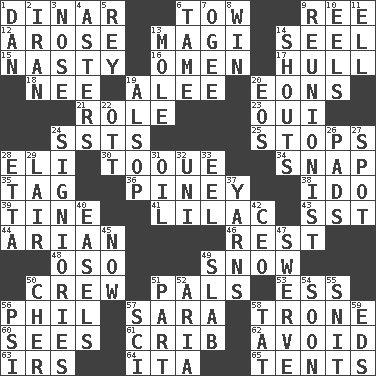 ACROSS 1. Middle Eastern gold or silver currency 6. Pull behind 9. To separate or throw off 12. Came up 13. Wise men 14. Stitch closed the eyes of (a falcon) 15. Offensive 16. Sign of something about to happen 17. Frame or body of a ship 18. Born 19. Toward shelter 20. Immeasurably long periods of time 21. Hero or heavy, e.g. 23. Fr. "Yes" 24. Fast planes 25. Ceases 28. Biblical high priest 30. Woman's close-fitting hat 34. Fastener 35. Label 36. Abounding in pines 38. Wedding promise 39. Prong on a fork 41. Pale purple color 43. Fast jet (abbr.) 44. Believer in; advocate of (suffix) 46. Respite 48. Bear (Spanish) 49. Overwhelm 50. Group working together 51. Friends 53. Curvy letter 56. Silvers or Donahue 57. "Two Mules for Sister ____" 58. Heavy duty weighing machine 60. Observes 61. Baby bed with high sides 62. Prevent from happening 63. Big collection agency 64. Call ___ day 65. Portable shelters DOWN 1. Daniel's nick name 2. SW Asia republic 3. Sense of smell 4. Michaelmas daisies 5. Marina Del _, California 6. Not wild 7. Double curve, resembling the letter S 8. Acquire through effort 9. One who advocates reunion 10. Snakelike fish 11. Pipe bend 13. Undercover agent 14. Yells 19. Columnist Joseph or Stewart 20. Greek goddess of the dawn 22. Baseball player Mel 24. Seigniories (variant) 26. Writing tablets 27. Blemish 28. Singer James 29. Den 31. Petroleum 32. Single; one (prefix) 33. Snakelike fish 37. Tall tales 40. Artist's stands 42. Corporate head (abbr.) 45. At this time 47. Turn aside suddenly 49. Broad, flat, thick piece 50. "Mermaids" star 51. Component 52. Roberta Peters solo 54. Within a short period 55. In a ____ (agitated or irritated) 56. 23rd letter of the Greek alphabet 57. _-fi 58. Make lace 59. Begley and Asner