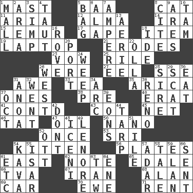 ACROSS 1. Vertical spar for supporting sails 5. Sound made by sheep 8. Feline 11. Operatic vocal solo 12. _ mater 14. Retirement account (abbr.) 15. Arboreal primate 17. Open wide 18. Detail 19. Portable computer 21. Eats (away) 23. Promise 25. Cause heat under the collar 26. Past tense of be (plural) 27. Snakelike fish 28. Compass dir. 31. Deep reverence 33. Afternoon social gathering 35. N. Chile seaport 37. Washington bills 38. Before (prefix) 40. Part of Q.E.F. 41. Continued (abbr.) 43. Small bed 45. Fish or hair follower 46. Make lace 47. Petroleum 50. Billionth: prefix 52. Single time 53. _ Lanka 54. Baby cat 56. Food holders 61. 90 degrees 62. Musical sound 65. Peak District village in England 66. Federal power corp. 67. SW Asia republic 68. ____ Jay Lerner 69. Auto 70. She-sheep 71. Monthly bill DOWN 1. Shopping center 2. Type of rug 3. Simple or foolish person 4. Strained 5. Container for groceries 6. In the manner of 7. Electrical Unit 8. Quote 9. Ancient Greek god of war 10. Scottish cap 13. Nest on high 16. Be footloose 18. Binary compound 20. Sweet dark-red dessert wine 22. Rounded earthenware pot or jar 24. Shed a tear 26. 270 degrees 28. Beget 29. Go away! 30. Erode 31. Small Philippine buffalo 32. Left 34. Curve 36. Former U.S. Attorney General Janet 37. Sep. follower 39. Immeasurably long periods of time 42. Do not 44. Canvas cover 48. Ancient Celtic tribe of eastern Britain 49. Poe poem 51. Mediterranean tributary 52. Baseball player Mel 54. Polynesian shrub of the pepper family 55. Austrian river, tributary to the Danube 57. The sixth month of the Jewish calendar 58. Story 59. Enthusiasm 60. Transmitted 61. And so on (abbr.) 63. The 23rd letter of the Hebrew alphabet 64. Compass dir.