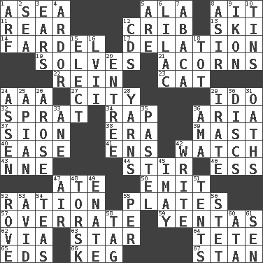 ACROSS 1. Toward the sea 5. In the manner of 8. Small island 11. Bring up, as a child 12. Baby bed with high sides 13. What Jean-Claude Killy likes to do 14. Pack 17. Conveyance 19. Finds the solution 21. Oak nuts 22. It's straight from the horse's mouth 23. Domesticated feline 24. Auto club (abbr.) 27. Municipality 29. Wedding promise 32. Small fatty European fish 34. Hit sharply and swiftly 36. Roberta Peters solo 37. The Jewish people; Israel 38. Period 39. Vertical spar for supporting sails 40. Comfort 41. Followers of ems 42. Observe 43. Compass dir. 44. Use a spoon 46. Curvy letter 47. Had dinner 50. Give off 52. Food allowance for one day 55. Food holders 57. Make much ado about nothing 59. Gossips 62. By way of 63. Play the lead 64. Wig 65. Begley and Asner 66. Cask 67. Comedian Laurel of Laurel & Hardy DOWN 1. Sandy's bark 2. Ocean 3. Hearing organs 4. Zeal 5. "We ___ not amused" (Victoria) 6. Pale purple color 7. Phillipine bananalike plant 8. SW Saudi Arabia district 9. Visual representation of an object 10. Airtight sealed metal containers 12. Music discs 15. Voters do this 16. 57 in ancient Rome 18. Small child 20. Main course 24. NE Netherlands city 25. Bee-related 26. Came up 28. Entertaining tales 29. Feeling or showing extreme anger 30. Flat circles 31. Curses 33. A saturated hydrocarbon 35. Soft color 36. Nanny (var.) 42. Compose 45. "If ____ say so..." 47. Atmosphere 48. Cod relative 49. Maternal 51. Portable shelters 52. Be footloose 53. Enthusiastic 54. Beverages made from leaves 55. For each 56. Proofreading order 58. Label 60. _ moment's notice (2 wds.) 61. Elected rep.