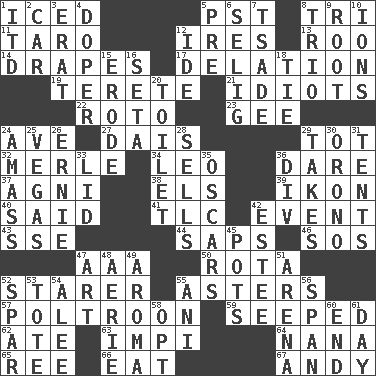 ACROSS 1. On the rocks 5. Pacific Standard Time (abbr.) 8. Three (prefix) 11. Pacific island yam 12. Angers 13. Friend of Pooh 14. Window treatments 17. Conveyance 19. Cylindrical with tapered ends 21. Foolish or stupid persons 22. Printing process, for short 23. Turn to the right 24. "___ Maria" 27. Raised platform 29. Small child 32. Haggard of country music 34. Lion 36. Have the gumption 37. Hindu god of fire 38. Raised railways 39. Visual representation of an object 40. Stated 41. Affectionate concern, for short 42. Incident 43. Compass dir. 44. Plant excrements 46. Mayday 47. Auto club (abbr.) 50. Roll call or roster of names 52. A viewer who gazes fixedly 55. Michaelmas daisies 57. Coward 59. Oozed 62. Had dinner 63. Body of Kaffir warriors 64. Nanny 65. To sift 66. Consume 67. Actor Griffith DOWN 1. It would 2. 4-wheeled motor vehicle 3. Part of Q.E.F. 4. Drug addict 5. Before (prefix) 6. Major League Baseball Commissioner Bud 7. Sadhe (variant) 8. Musical group of three 9. Carrot, for example 10. Charged particles 12. Binary compound 15. Eat (away) 16. Stalk of a moss capsule 18. Standoff 20. Bathroom plumbing fixture 24. Collect or gather 25. Viva Las _ 26. Bert's buddy 28. Makes a sale 29. Proceeds 30. U. of Maine site 31. Portable shelters 33. Hat (slang) 35. Motion picture awards 36. HTML Container Element 42. First name in cosmetics 45. Plant holders 47. Tate display 48. Nest on high 49. Scent 51. Sports stadium 52. Coast Guard woman 53. Carryall 54. Toward shelter 55. Cuckoo 56. Connect, as a bridge 58. Elect 60. Conclude 61. 24 hours