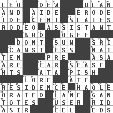 ACROSS 1. Lion 4. Morning condensation 7. ____ Bator, Mongolia 11. Added to 12. Helper 13. Eat (away) 14. Binary compound 15. Penny 16. Chalkboards 17. Cowboy competition 19. Helper 21. Sis' sibling 23. Double curve, resembling the letter S 24. Do not 25. Player for Phoenix 26. _ Lanka 29. 2nd pers. sing. pres. of can (arch.) 30. Curvy letter 31. Floor protector 32. "___ Little Indians" 33. Before (prefix) 34. White ___ sheet 35. "We ___ not amused" (Victoria) 36. Hearing organ 37. Gospel singer Marvin 40. Mountains (abbr.) 41. _ moment's notice (2 wds.) 42. Expression of disdain 43. Old wives' tales, e.g. 45. Had dinner 46. Dwelling 51. White Person, in Hawaii 55. Declaimed 56. Unable to walk 58. Separate the seeds from cotton 59. Hauls 60. One who makes use of a thing 61. To free from 62. SW Saudi Arabia district 63. Snakelike fish 64. Begley and Asner DOWN 1. Den 2. Inside; within (prefix) 3. Wrote a lyric poem 4. Expire 5. Pulitzer Prize-winning author Ferber 6. Soaks 7. A salt of uric acid 8. Globular water bottle used in Asia 9. An important port of Yemen 10. Egg locale 12. Oak nuts 13. Otherwise 16. Signals 18. Inky black, to poets 20. Lush 22. Baseball player Mel 24. Natives or inhabitants of Denmark 25. Spanish missionary in California 26. Box-office sellout 27. To erase 28. Call ___ day 29. Foregone conclusion 32. Scottish cap 33. Eucharist need 36. Having ears or earlike features 37. Health resort 38. One or the other of two 39. Toward the sea 43. 61 cubic inches 44. Lyric poems 46. Roll call or roster of names 47. Greek god of love 48. Suttee (variant) 49. A slight indication 50. Relaxation 52. Legendary monster 53. Put down 54. Conclusions 57. Cartoonist voice _ Blanc