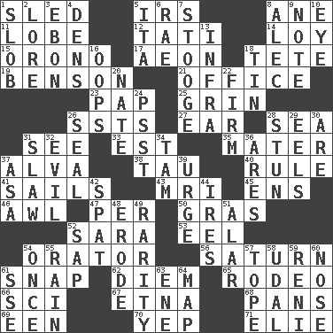 ACROSS 1. Downhill vehicle 5. Big collection agency 8. A saturated hydrocarbon 11. Ear part 12. Jacques of French films 14. Myrna of the movies 15. U. of Maine site 17. A really long time 18. Wig 19. Gillaume's butler role 21. Public position 23. Infant food 25. Amused look 26. Fast planes 27. Ewer handle 28. Ocean 31. Perceive with the eye 33. Eastern Standard Time (abbr.) 35. Mother 37. Inventor's middle name 38. The 19th letter of the Greek alphabet 40. Court order 41. Moves on water 43. Medical imaging device (abbr.) 45. Followers of ems 46. Leather borer 47. For each 50. Pate de foie ____ 52. "Two Mules for Sister ____" 53. Snakelike fish 54. Speaker 56. Titan orbits this 61. Fastener 62. South Vietnam president (1954) 65. Cowboy competition 66. _-fi 67. Inactive volcano in Sicily 68. Zero-star reviews 69. Car or cant ending 70. Slangy assent 71. Writer Wiesel DOWN 1. Messy guy 2. Old wives' tales, e.g. 3. Inky black, to poets 4. Hiding places for outlaws 5. Call ___ day 6. Actress Charlotte 7. Moe Howard, for one 8. Actor Baldwin 9. Observe 10. Sight organ 13. Kind of red light 16. I made a mistake 18. Shallow baking pan 20. Nathan's nickname 22. Not soft or yielding to pressure 24. Inconspicuous attention getter 26. Lick closed 28. Surprise greatly 29. Snakelike fish 30. "We ___ not amused" (Victoria) 31. Cole _ (cabbage dish) 32. Morally bad or wrong 34. Scottish cap 36. Ancient Greek god of war 37. White ___ sheet 39. Goad 42. Petty quarrel 44. Angers 48. Wear away 49. Noteworthy scarcity 51. Having or resembling wings 52. Plant excrement 54. Single time 55. Precipitation 57. Drink excessively 58. Freehold land 59. Painter Guido (1575-1642) 60. Characteristic smell of wine 61. Compass dir. 63. Compass dir. 64. Atlas unit