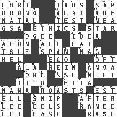 ACROSS 1. Australian parrot (variant) 5. Small boys 9. Plant excrement 12. U. of Maine site 14. Mountain range southwest of Kyrgyzstan 15. "We ___ not amused" (Victoria) 16. Relating to or accompanying birth 17. Trial 18. Teachers' org. 19. Girls' org. (abbr.) 20. Moral principles 23. Play the lead 24. Double curve, resembling the letter S 25. The main thing one is thinking about 27. Age 30. 100% 32. Consume 33. Small island 34. Connect, as a bridge 36. Tired old horse 38. Cartoonist voice _ Blanc 39. Environmental prefix 40. Often (poetically) 43. Insect wing 46. It's straight from the horse's mouth 48. Small Philippine buffalo 49. The grampus (Milton) 51. Compass dir. 52. Confront 53. "Tell ____ the Marines!" 54. Singer James 56. Nanny 58. Cooks with dry heat, as in an oven 61. Eastern Standard Time (abbr.) 64. Pipe bend 65. Sever or remove by pinching or nipping 66. Following 68. Area sheltered from the wind 69. Snakelike fish 70. The wife of a rajah (variant) 71. Allow 72. Comfort 73. Raze (variant) DOWN 1. Protracted 2. Mouths or openings 3. Round or rotation of duties 4. _ tizzy (2 wds.) 5. Jacques of French films 6. Actor Baldwin 7. Hyrax 8. Be seated 9. Before Barbara or Clara 10. Type of rug 11. Lightbulb-shaped fruit 13. Cassini of fashion 21. Afternoon social gatherings 22. Assistant 23. Stalk of a moss capsule 24. Single 26. Daniel's nick name 27. Direct toward a target or goal 28. Compass dir. 29. Spanish pot 31. Shoestrings 35. Annoying sounds 37. Went 41. Enemy 42. Make lace 44. Globular water bottle used in Asia 45. Tate display 47. Remaining after all deductions 48. Nanny (var.) 50. Pupil covering 53. An arm off of a larger body of water 55. Russian ruler of old 56. 1994 drama film starring Jodie Foster 57. Toward shelter 59. Petroleums 60. Domed church section 61. Inactive volcano in Sicily 62. Perceives with the eye 63. Relationship diagram 65. Perceive with the eye 67. At a great distance