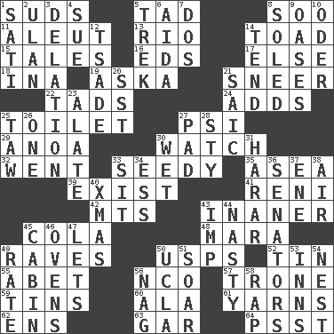 ACROSS 1. Beer foam 5. Small boy 8. "Barney Miller" actor Jack 11. Native American of Southwest Alaska 13. River (Sp.) 14. Frog relative 15. Stories 16. Begley and Asner 17. Otherwise 18. _ tizzy (2 wds.) 19. "____ silly question..." 21. Scornful expression 22. Bits 24. Does sums 25. Bathroom 27. 23rd letter of the Greek alphabet 29. Small Philippine buffalo 30. Observe 32. Gone 33. Sleazy 35. At sea 39. Be extant 41. Painter Guido (1575-1642) 42. Mountains (abbr.) 43. More lacking in sense or substance 45. Root beer relative 48. Hindu Mythology: god of death 49. All-night dance parties 50. United States Postal Service (abbr.) 52. Shallow baking pan 55. Collude with 56. Non-commissioned officer (abbr.) 57. Marketplace scale 59. Canisters 60. In the manner of 61. Tall tales 62. Followers of ems 63. Slender fish 64. Inconspicuous attention getter DOWN 1. Suttee (variant) 2. ____ Bator, Mongolia 3. Accusation by an informer 4. Institute legal proceedings 5. Long journey 6. Opera by Verdi 7. Two (Sp.) 8. Having a sole or soles 9. Fertile tracts in a desert 10. River in Europe 12. Sadhe (variant) 14. Watch over 20. Fast jet (abbr.) 21. Ketch in the Levant 23. Having winglike extensions 25. The 23rd letter of the Hebrew alphabet 26. Single 27. Writing tablet 28. Filthy place 30. Dripping 31. Ethiopian city, capital of Harari 33. Be seated 34. Curvy letter 36. Legislators 37. Compass dir. 38. Wind 40. Dec. holiday 43. Naughty child 44. Smutty 45. Small house or cottage 46. Baking chambers 47. Allows 49. Pace 50. Southern CA. univ. 51. Fly high 53. Taverns 54. Egg locale 56. Tired old horse 58. Reproach for some lapse or misdeed