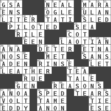 ACROSS 1. Girls' org. (abbr.) 4. Anneal 8. Hindu Mythology: god of death 12. Followers of ems 13. Stare 14. ____ Bator, Mongolia 15. 61 cubic inches 18. Jacques of French films 19. Downhill vehicle 20. Manned the helm 22. Ocean 23. Cause heat under the collar 24. Small bed 25. Car or cant ending 26. Of or relating to Laos or its people 30. Santa ___, CA 33. Prevent from occurring 36. Inactive volcano in Sicily 37. Sense of smell 39. Was introduced to 40. Without 41. Arabian gulf 42. Wash lightly 44. Allow 45. Cordwainer's material 47. Afternoon social gathering 50. Sorrow 51. Lie 53. Commissioned mil. rank 54. Thinks logically 57. Small Philippine buffalo 59. Moved rapidly 61. Pulls into pieces 63. Electrical Unit 64. Not wild 65. Standoff 66. Whirlpool 67. At once, immediately (arch.) 68. Compass dir. DOWN 1. Set 2. Sever or remove by pinching or nipping 3. Having gotten out of bed 4. Make mention of 5. Mild oath 6. The first octave above the treble staff 7. Luau accessory 8. French bagpipes 9. Silent film actress Nazimova 10. Actress Charlotte 11. Also 16. Writer Wiesel 17. Hero or heavy, e.g. 21. Be inclined (to) 22. "Barney Miller" actor Jack 24. Automobile 26. Allows 27. Slanted text style (abbr.) 28. Singer Murray 29. Political cartoonist Thomas 30. Of or related to the anus 31. Connecting point 32. Toward the sea 34. Independent ruler or chieftain 35. "___ Little Indians" 38. Plea 42. Portuguese money of account (variant) 43. Singer James 46. Attila the _ 48. Compass direction 49. _ vera 52. Maternal 53. Gilded 54. San ____ (Riviera town) 55. Paradise 56. Indian titles of respect 57. "___ Maria" 58. Dreamland 59. R.R. building 60. Baking dish 62. Observe