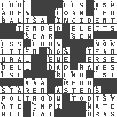 ACROSS 1. Ear part 5. Raised railways 8. Viper 11. Ancient Greek god of war 12. Rich soil 13. Lion 14. Greek mezzo-soprano Agnes 17. Event 19. Watched over 21. Chooses 22. Dry up 23. Elected rep. 24. Double-curved letter 27. Greek god of love 29. Immediately 32. 61 cubic inches 34. Two (Sp.) 36. Pull apart 37. Mountain range 38. Compass dir. 39. Celtic language 40. Small valley 41. Male parent 42. All-night dance parties 43. Compass dir. 44. Former U.S. Attorney General Janet 46. Eastern Standard Time (abbr.) 47. American Automobile Association (abbr.) 50. Do over again 52. A viewer who gazes fixedly 55. Michaelmas daisies 57. Coward 59. Tootsie (variant) 62. Had dinner 63. Body of Kaffir warriors 64. Nathan's nickname 65. To separate or throw off 66. Ingest 67. Mouths or openings DOWN 1. Experiment locale 2. Mouth or opening 3. Waist strap 4. _____ Park, CO 5. Period of immesurable duration 6. Shoestrings 7. Grin 8. Actor Baldwin 9. Transmitted 10. Plant holders 12. Hat (slang) 15. Scornful expression 16. The sixth month of the Jewish calendar 18. Lair 20. Eaten away 24. Evade 25. Fathers 26. Lacking originality or spontaneity 28. Echolocation 29. Effrontery 30. Fertile tracts in a desert 31. Obtain by seizing forcibly or violently 33. Pipe bend 35. Spring feasts 36. Beverage made from leaves 42. Cowboy competition 45. Remaining after all deductions 47. Tate display 48. Nest on high 49. Scent 51. U. of Maine site 52. Practice fight 53. Lug 54. Toward shelter 55. Black tropical American cuckoo 56. Play the lead 58. Choose 60. R.R. building 61. Affirmative reply