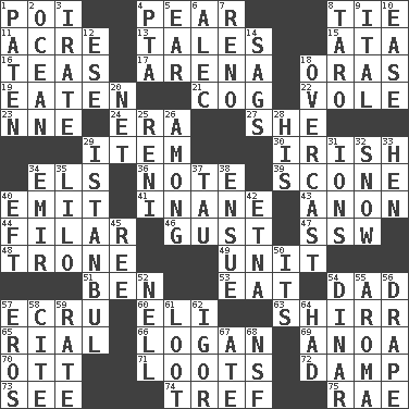 ACROSS 1. Luau course 4. Lightbulb-shaped fruit 8. Neckwear 11. 1/640 square mile 13. Lies 15. _ moment's notice (2 wds.) 16. Afternoon social gatherings 17. Sports stadium 18. Mouths or openings 19. Ingested 21. Gear tooth 22. Grand slam 23. Compass dir. 24. Epoch 27. A female animal or person 29. A distinct part 30. From or relating to Ireland 34. Raised railways 36. Musical sound 39. Biscuitlike quick bread 40. Give off 41. Silly 43. At once, immediately (arch.) 44. Of or pertaining to a thread or threads 46. Abrupt rush of wind 47. Compass dir. 48. Heavy duty weighing machine 49. A single undivided whole 51. Benjamin's nick name 53. Erode 54. Male parent 57. Shade of tan 60. Connecticut Ivy Leaguer 63. Bake eggs in their shells 65. Monetary unit of Yemen 66. Utah city north of Ogden 69. Small Philippine buffalo 70. Baseball player Mel 71. Plunders 72. Moist 73. Observe 74. Unclean, religiously 75. Actress Charlotte DOWN 1. Eucharist need 2. Sea 3. Feeling or showing extreme anger 4. Parent Teacher Association (abbr.) 5. Hearing organ 6. Actor Baldwin 7. Former U.S. Attorney General Janet 8. Pacific island yam 9. Slanted text style (abbr.) 10. Relaxation 12. Compass dir. 14. Droops 18. Cloudy 20. Fish or hair follower 25. Painter Guido (1575-1642) 26. Amid 28. Part of HMS, perhaps 29. Byzantium, centuries later 31. Charged atoms 32. Frozen precipitation 33. Layer 34. Arab leader 35. _ and Stitch 37. The 19th letter of the Greek alphabet 38. Follow as a consequence or result 40. Lizard (obsolete) 42. Inactive volcano in Sicily 45. To separate or throw off 50. It is 52. 1994 drama film starring Jodie Foster 54. Middle Eastern gold or silver currency 55. Scent 56. Window treatment 57. Greek god of love 58. Quote 59. Pace 61. Plunder 62. Russian composer Stravinsky 64. Possessed 67. Had dinner 68. Overdraft (abbr.)
