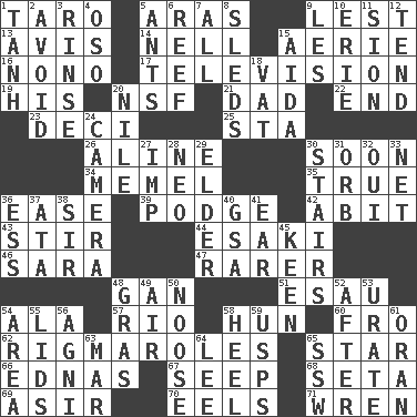 ACROSS 1. Edible starchy tuberous root 5. Caspian sea tributary 9. For fear that 13. Deliberation 14. 1994 drama film starring Jodie Foster 15. Nest on high 16. Words to Nanette 17. Boob tube 19. Part of HMS, perhaps 20. Science/research agcy. 21. Male parent 22. Conclude 23. Tenth: prefix 25. R.R. building 26. Place in a line 30. Within a short period 34. Klaipeda city 35. Loyal 36. Relaxation 39. Puddle 42. "This won't hurt ____!" 43. Disorderly outburst 44. 1973 Nobel Price Winner (Physics) Leo 46. "Two Mules for Sister ____" 47. More uncommon 48. Separate the seeds from cotton 51. He sold his birthright 54. In the manner of 57. _ de Janeiro 58. Attila the _ 60. Away 62. Complicated, petty procedures 65. Play the lead 66. Ferber et al. 67. Ooze 68. Bristle 69. SW Saudi Arabia district 70. Snakelike fish 71. Songbird DOWN 1. Hyperbolic tangent 2. Stay clear from 3. Remove soap 4. Bear (Spanish) 5. Pismires 6. Coral ridge 7. 100% 8. Bobsleighs 9. French article 10. 4th largest of the Great Lakes 11. The Jewish people; Israel 12. Be inclined (to) 15. Opera by Verdi 18. Large container 20. Mediterranean tributary 24. Device for capturing images 27. Naughty child 28. Modern: prefix 29. A person who is older than you are 30. Flight of steps 31. Globe 32. Fr. "Yes" 33. Fish or hair follower 36. Double-curved letter 37. "One Day ___ Time" 38. Title for a knight 40. Girls' org. (abbr.) 41. Ewer handle 45. Peachy ____! 48. Pate de foie ____ 49. Wind 50. Trap for birds or small mammals 52. Following 53. A salt of uric acid 54. Length times width 55. Flaplike coverings 56. Hindu god of fire 58. The bottom of a shoe or boot 59. United States Postal Service (abbr.) 61. Northwest Algerian city 63. Spoil 64. Area sheltered from the wind 65. Compass dir.