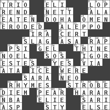 ACROSS 1. Musical group of three 5. Biblical high priest 8. Chop off 11. Tear apart 12. Remaining after all deductions 14. Chicken ___ king 15. Consumed 17. Capital of the state of Qatar 18. Sign of things to come 19. Worn away 21. City in Syria 23. Lyricist Gershwin 25. Sure thing 26. Volcanic refuse 27. White ___ sheet 28. Reproach for some lapse or misdeed 31. Air pressure measure (abbr.) 33. Set 35. One or ones belonging to thee 37. Christmas carol 38. Mayday 40. Russian composer Stravinsky 41. _____ Park, CO 43. Affirmative reply 45. By way of 46. _ moment's notice (2 wds.) 47. Frozen water 50. Past tense of be (plural) 52. "Two Mules for Sister ____" 53. Modern: prefix 54. Poems 56. Disco prop 61. South Vietnam president (1954) 62. Lightbulb-shaped fruit 65. Ethiopian city, capital of Harari 66. Basketball assoc. 67. Writer Wiesel 68. Indian skirt 69. Viper 70. Filthy place 71. Otherwise DOWN 1. Woody plant 2. Buttocks 3. To the inside or interior of 4. Wrote a lyric poem 5. Conclude 6. Lion 7. New York city 8. Desk light 9. Butter sub 10. Baking dish 13. Stories 16. Famous astronaut Armstrong 18. Elect 20. To trail on the ground 22. Part of Q.E.F. 24. Ripens 26. Filth; sediment 28. Swiss mountan, "Queen of the Mountains" 29. Small Philippine buffalo 30. For each 31. Mail 32. Stalk of a moss capsule 34. Myrna of the movies 36. Hub of activity 37. Teachers' org. 39. Stitched 42. Thailand, formerly 44. Observes 48. Streamer paper 49. Artist's stands 51. Writer of Portnoy's Complaint (1969) 52. Symbol (abbr.) 54. Chest bones 55. Pile 57. Raze (variant) 58. Of the mouth 59. Soap units 60. One of the Great Lakes 61. Heredity factor (abbr.) 63. Small island 64. Marina Del _, California