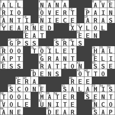 ACROSS 1. Everything 4. Grandmother 8. "___ Maria" 11. River (Sp.) 12. Unconcealed 14. Ache 15. Opposed to 17. Sibling's daughter 18. Caspian sea tributary 19. Had a strong desire 21. Xylene (variant) 23. Ingest 24. Car or cant ending 25. Global Positioning Systems (abbr.) 27. Indian titles of respect 30. Friend of Pooh 31. Bathroom plumbing fixture 34. Actor Linden 37. Fitting 38. Let have 39. Biblical high priest 40. Curvy letter 41. Food allowance for one day 43. Compass dir. 44. Hiding places for outlaws 45. Von Bismarck 47. Epoch 49. Portuguese money of account (variant) 50. Biscuitlike quick bread 52. Deli grouping 56. Implement 57. Mother 60. Emitted 61. Grand slam 62. Join together 63. Non-commissioned officer (abbr.) 64. One (Scot) 65. Letter starter 66. Plant excrement DOWN 1. Like ___ of sunshine 2. Actor's bit 3. Globular water bottle used in Asia 4. Music written for nine 5. Enthusiastic 6. Born 7. Curve 8. Composer Copland 9. Small bottle 10. Followers of ems 13. John Ritter's dad 14. Light colored 16. Angers 20. Political cartoonist Thomas 22. Consenting reply 25. Republicans 26. Cooking vessels 27. Narrow boards 28. Painter Guido (1575-1642) 29. "Tell ____ the Marines!" 30. Actress Charlotte 32. Legendary monster 33. SW Asia republic 34. Behest 35. In addition 36. Falsehood 42. Christmas carol 44. Daniel's nick name 46. Beverages made from leaves 47. Learning spot: Fr. 48. Hero or heavy, e.g. 49. Less widely known 50. Within a short period 51. Australian flightless bird 52. Stalk of a moss capsule 53. Not women's 54. South American Indian 55. Obstruct or block passage 56. Federal power corp. 58. Plus 59. Make a knot