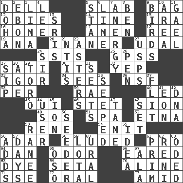 ACROSS 1. Small valley 5. Broad, flat, thick piece 9. Container for groceries 12. Off-Broadway awards 14. Prong on a fork 15. Retirement account (abbr.) 16. Baseball hit which scores a run 17. So be it 18. To separate or throw off 19. Santa ___, CA 20. Sillier 23. Allodial 24. Fast planes 25. Global Positioning Systems (abbr.) 27. Suttee (variant) 30. ___ a Wonderful Life 32. Slangy assent 33. Composer Stravinsky 34. Perceives with the eye 36. Science/research agcy. 38. For each 39. Actress Charlotte 40. Directed 43. Fr. "Yes" 46. Proofreading order 48. The Jewish people; Israel 49. Distress signal 51. Health resort 52. Inactive volcano in Sicily 53. French philosopher Descartes 54. Give off 56. The sixth month of the Jewish calendar 58. Evaded 61. Adept person 64. Daniel's nick name 65. Aroma 66. Having ears or earlike features 68. Color 69. Bristle 70. Place in a line 71. Compass dir. 72. Relating to the mouth 73. Among DOWN 1. Capital of the state of Qatar 2. Inky black, to poets 3. Pale green bean 4. Area sheltered from the wind 5. Comedian Laurel of Laurel & Hardy 6. Welles in "The Third Man" 7. Disorder of the immune system 8. Benjamin's nick name 9. Avian creatures 10. Length times width 11. Highlander 13. Indian titles of respect 21. Nuclear Threat Initiatives 22. Michaelmas daisies 23. United States Postal Service (abbr.) 24. Title for a knight 26. Fenced enclosure 27. Small drink 28. Ripen 29. "Corrida" creature 31. Theater features 35. Oozed 37. Secret move to avoid paying debts 41. Period of immesurable duration 42. Heredity factor (abbr.) 44. One who makes use of a thing 45. Electrically charged atom 47. Not wild 48. Put into a specified state 50. Sowing specialist 53. Indian princess (variant) 55. The content of cognition 56. Sums up 57. 24-hour periods 59. Globular water bottle used in Asia 60. Mountain range 61. Demure 62. Painter Guido (1575-1642) 63. Wrote a lyric poem 65. Bear (Spanish) 67. According to