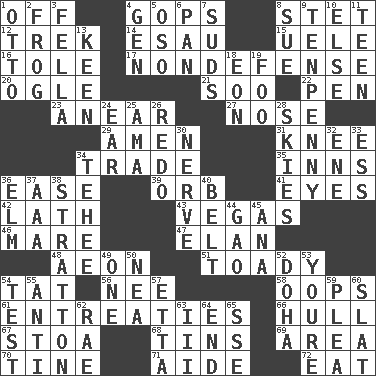 ACROSS 1. Below a satisfactory level 4. Republicans 8. Proofreading order 12. Long journey 14. Son of Isaac 15. Ubangi River tributary 16. Lacquered or enameled metalware 17. Unrelated to defense, as in spending 20. Stare at amorously 21. "Barney Miller" actor Jack 22. Animal enclosure 23. Approach 27. Characteristic smell of wine 29. So be it 31. Leg joint 34. Barter 35. Taverns 36. Comfort 39. Globe 41. Sight organs 42. Thin strip of wood or metal 43. Viva Las _ 46. Female horse 47. Style 48. Age 51. Sycophant 54. Make lace 56. Born 58. I made a mistake 61. Pleas 66. Frame or body of a ship 67. Portico 68. Airtight sealed metal containers 69. Length times width 70. Prong on a fork 71. Assistant 72. Consume DOWN 1. "Beetle Bailey" pooch 2. Tree-dwelling hopper 3. Man or boy (slang) 4. Commissioned military rank (abbr.) 5. Bear (Spanish) 6. Baking dish 7. Beer foam 8. Take to court 9. 3-inch nail 10. Otherwise 11. Adolescent 13. Peachy ____! 18. Period of immesurable duration 19. Egg _ yung 24. Hearing organ 25. Wet nurse (var.) 26. Do over again 28. Atmospheres 30. Boldness 32. Compass dir. 33. Curvy letter 34. Giggle 36. Shade tree 37. Auto club (abbr.) 38. Ski resort town in Vermont 40. Waist strap 44. E Mali city 45. Santa ___, CA 49. Single 50. Teachers' org. 52. Capital of the state of Qatar 53. You are 54. Trial 55. Against 57. Singer James 59. Entreaty 60. Narrow board 62. Actress Charlotte 63. One more than two 64. Conclude 65. Compass dir.